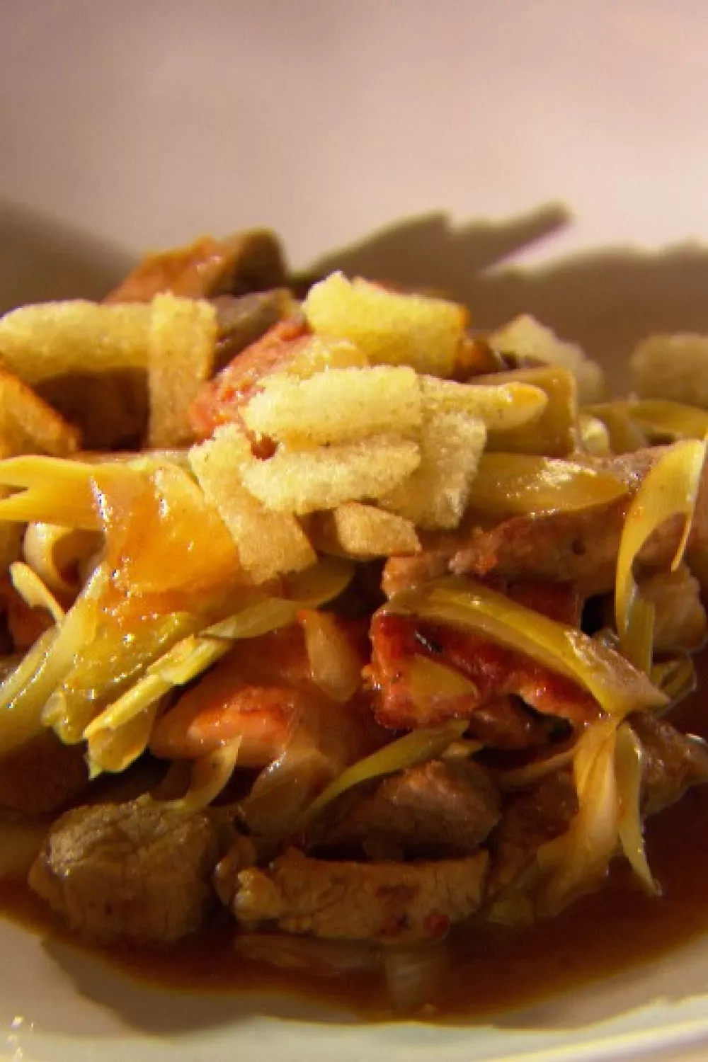Varkensvluggertje is een snel, smaakvol wokgerecht met malse varkensspiering en krokant buikspek, verfrist door limoen en citroengras. Witloof en huisgemaakte croutons zorgen voor een aangename bitterheid en knapperigheid, terwijl zoetzure saus en een vleugje chili voor zoetzure en pittige tonen zorgen. Ideaal als doordeweekse avondmaaltijd of hartige lunch in het najaar.