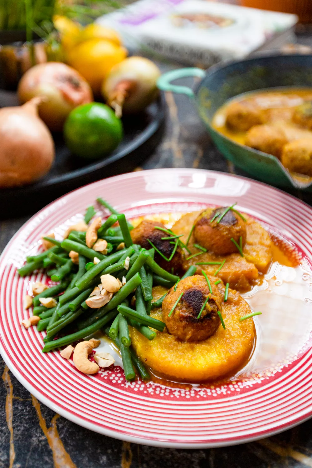 Verrassend zoet en kruidig, dit vegan gerecht combineert sappige plantaardige gehaktballetjes met een romige currysaus en warm gebakken ananas. De saus op basis van appelsap, sjalot en kokosroom wordt langzaam gestoofd en gepureerd, terwijl de ananas licht karameliseert en knapperige sperzieboontjes frisse tegenhanger bieden. Ideaal als doordeweekse comfortmaaltijd of zomers diner, afgewerkt met gezouten cashewnoten en verse bieslook.