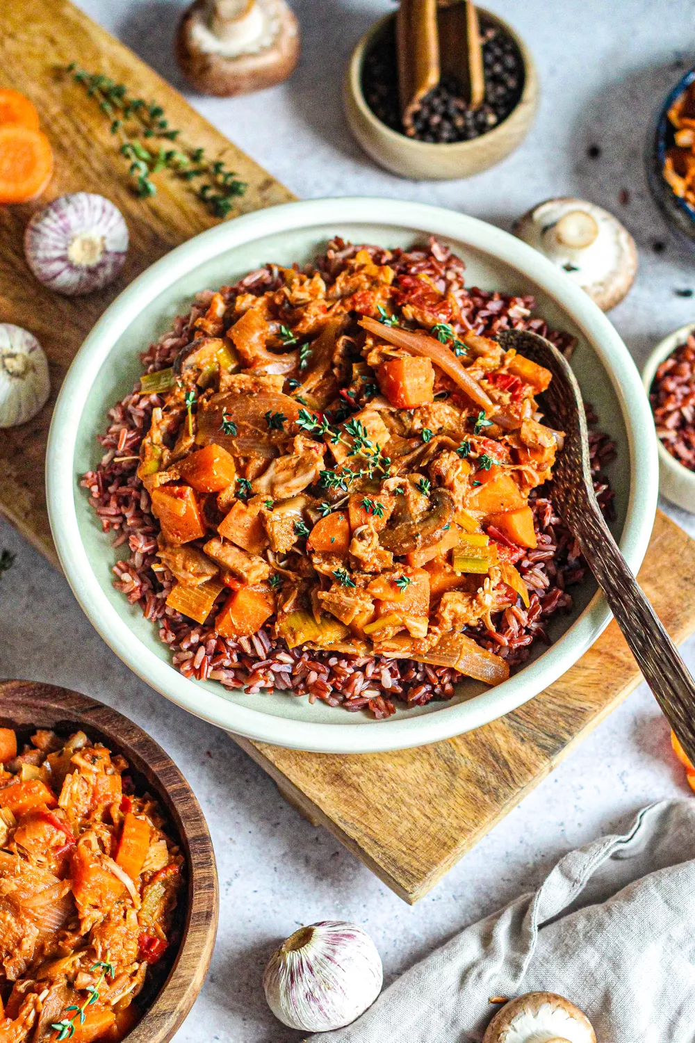 Deze vegan jackfruitcurry brengt hartige tomaat, stevige champignons en zoete wortel samen met kruidige tijm en paprikapoeder voor een warme, troostrijke maaltijd. Sjalot en knoflook fruiten, jackfruit wordt meebakken en alles suddert langzaam in rode wijn en groentebouillon zodat de smaken diep en vol intrekken. Serveer met voedzame rode rijst en eventueel edelgistvlokken voor een hartig umamiaccent bij een gezellige avondmaaltijd.
