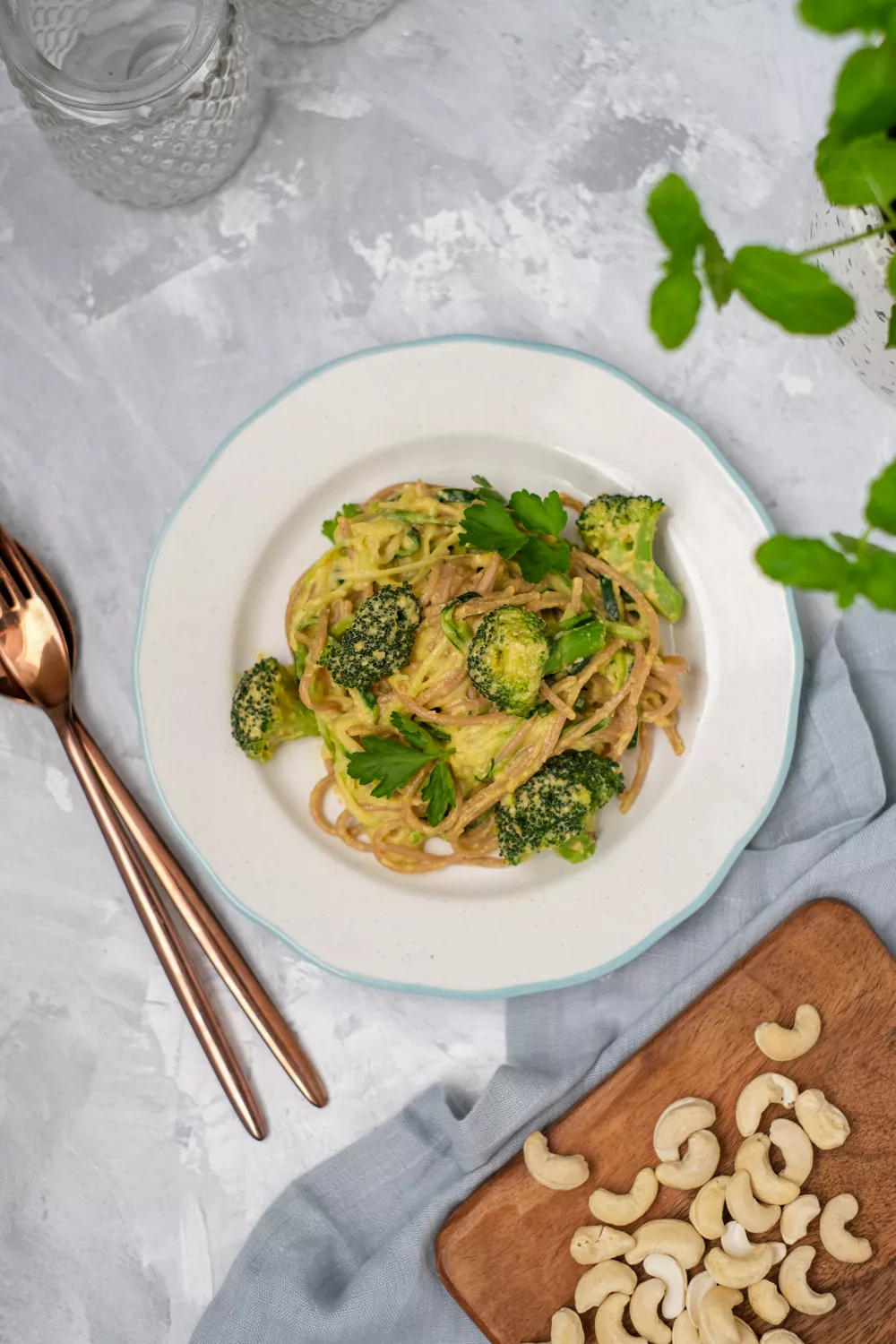 Meng de speltpasta met de courgetti, de broccoliroosjes en de cashewsaus. Kruid naar smaak met peper en zout. Verdeel over verschillende bordjes en werk af met een takje groen.