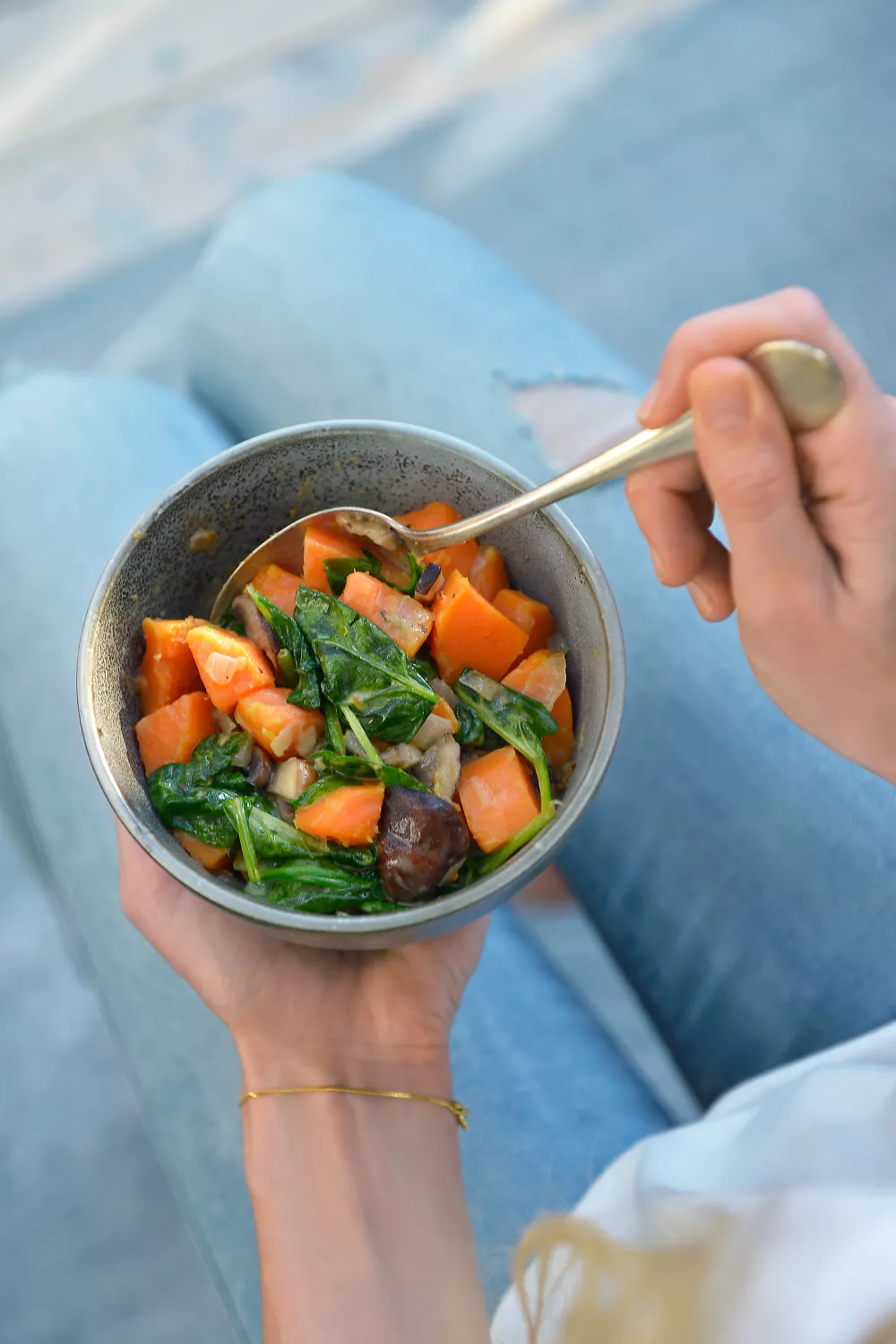 Stappenplan om recept “Vegan roompotje met zoete aardappel en spinazie” te bereiden