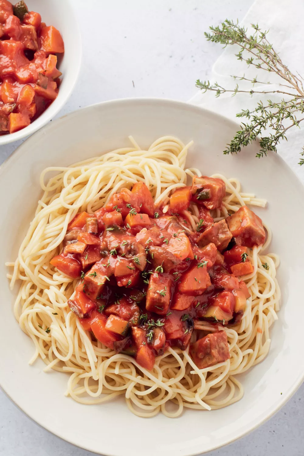 Deze romige vegan spaghetti combineert krokant geroosterde seitan met een rijke tomatensaus boordevol wortel, courgette en champignons. De groenten worden langzaam gestoofd, de champignons kort gebakken en de seitan in de oven geroosterd, waarna alles wordt afgerond met speltroom en Provençaalse kruiden voor diepe smaak. Perfect als verwarmende doordeweekse maaltijd of gezellig familiediner in het herfst en winterseizoen.