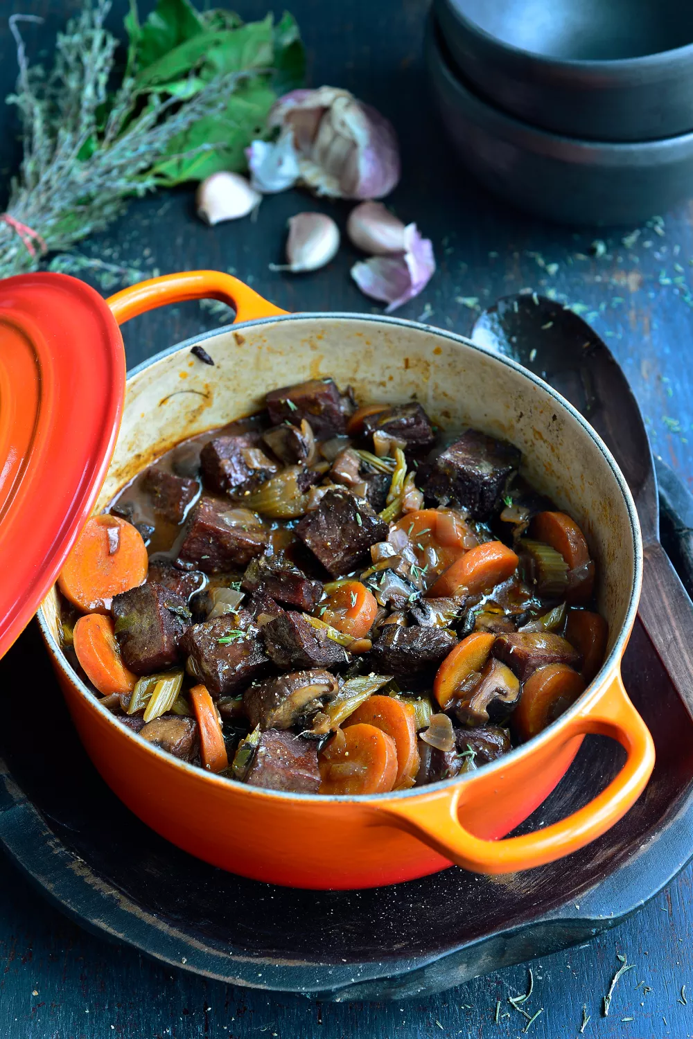 Deze vegan stoverij met malse seitan en geroosterde kastanjechampignons heeft een diepe hartige smaak door rode wijn, shoyu en een frisse toets van sinaasappelzeste. De seitan wordt lang gemarineerd, groenten sudderen zachtjes en de champignons worden in de oven geroosterd zodat er een rijke umamisaus ontstaat, ideaal als troostmaaltijd in de herfst of voor een gezellig weekenddiner. Kruidig, vol en plantaardig, serveer met aardappelpuree of stevig brood.