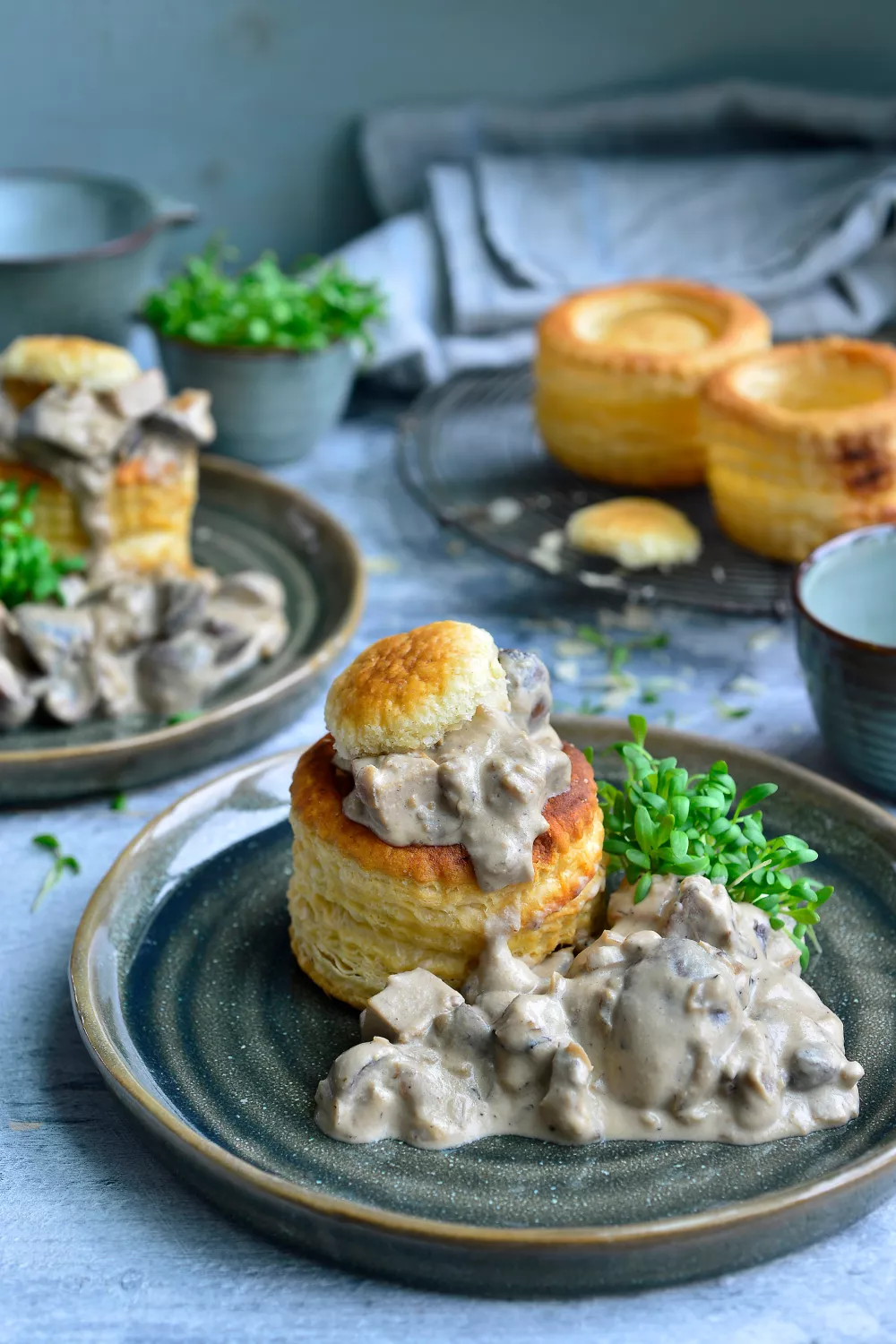 Serveer de vegan vol-au-vent in bladerdeegkoekjes gemaakt van vegan blanderdeeg. Werk af met wat groen.