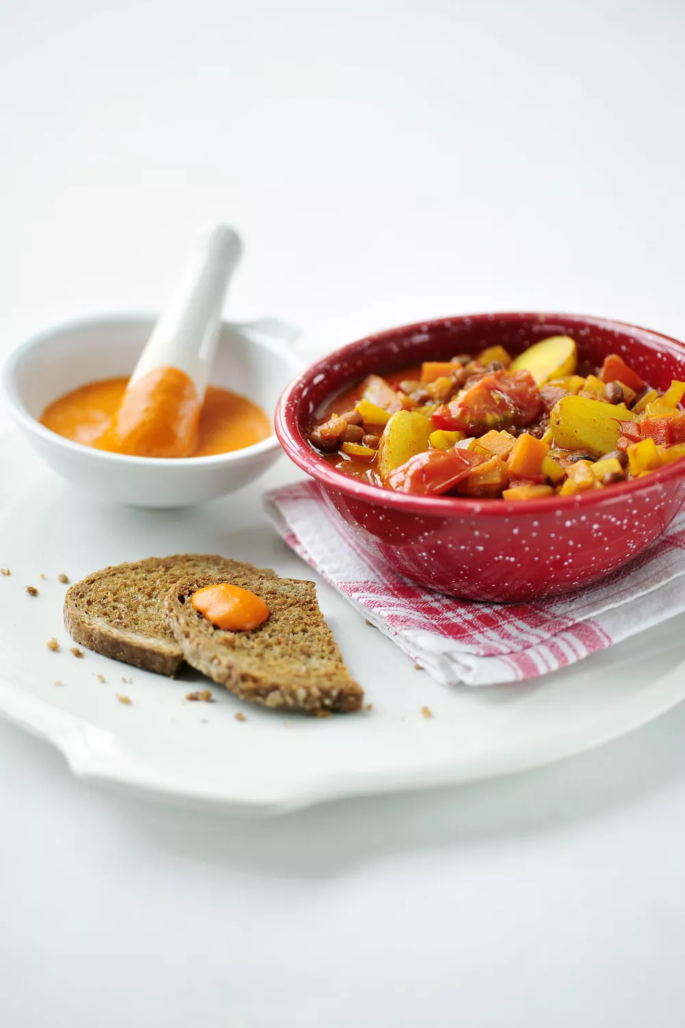 Maak de rouille door de knoflook, aardappeltjes, bouillon en tomatenpuree samen te mixen. Voeg er geleidelijk aan, al mixend, de olijfolie aan toe en breng op smaak met zeezout en cayennepeper.