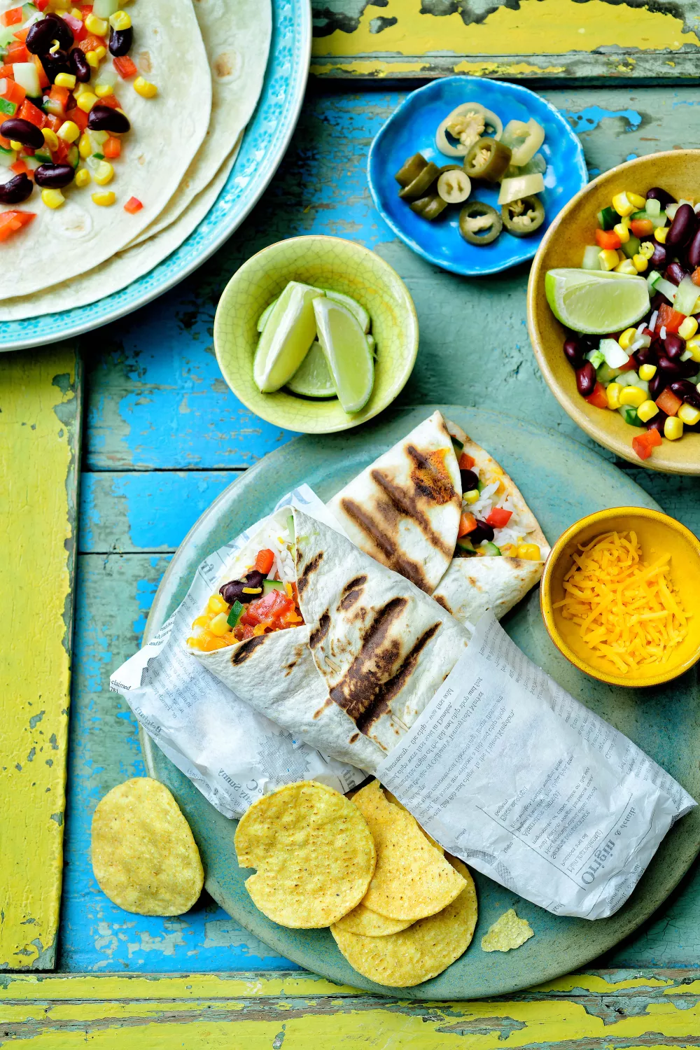 Verhit een grill, paninitoestel, barbecue of oven. Beleg een tortillavel met bonenspread, rijst, barbecuesaus en pulled jackfruit. Lepel er wat maïs-salsa over. Werk af met cheddar. Plooi dicht en grill even tot de kaas gesmolten is. Serveer met limoen en jalapeno’s.