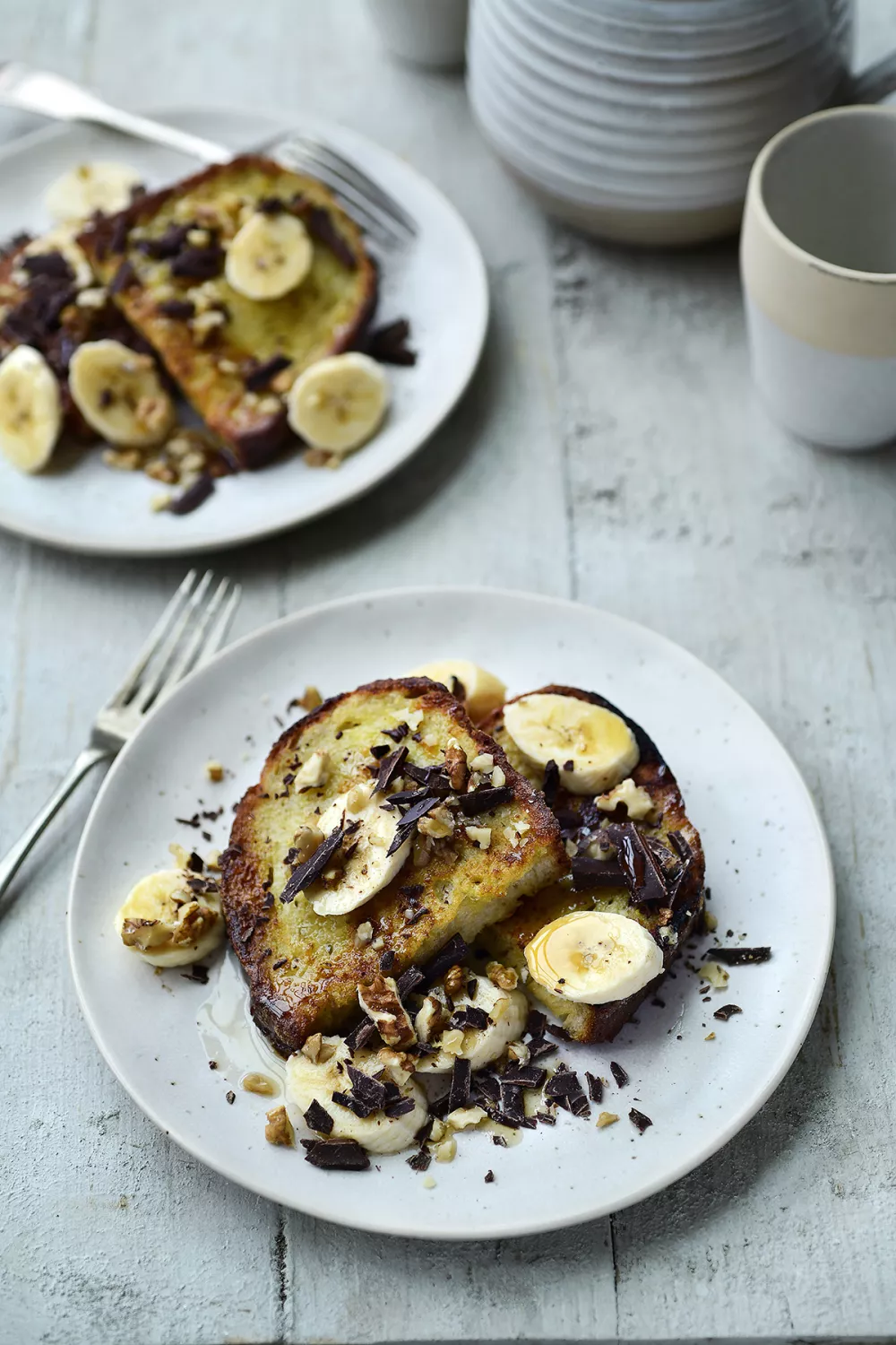 Een verleidelijke twist op verloren brood met zoete banaan, knapperige walnoten en stukjes pure chocolade, afgewerkt met fluweelachtige maple syrup. Het brood wordt kort in een mengsel van ei en melk gewenteld en in boter goudbruin gebakken voor een krokant en romig resultaat. Perfect als warm weekendontbijt of herfstige brunch.