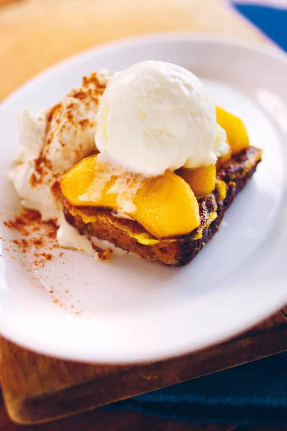 Dresseer de warme gekaramelliseerde appels op de gebakken peperkoek en serveer hier bovenop een bolletje vanille-ijs. Lepel er ook een flinke portie kaneelroom bij.