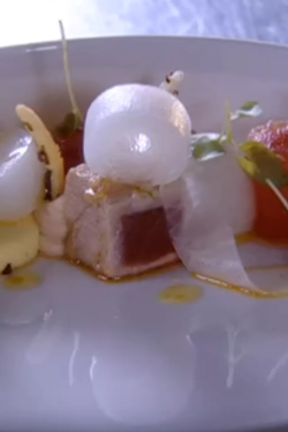 Versnijd de helft van het derde stuk tonijn in kleine stukjes, voeg de rest van de ingrediënten toe en draai in de pacojet tot een crème. Wrijf de crème door een tamis en werk af met een druppeltje sesamolie en zout. Schep de crème in een spuitzak en leg in de koelkast.