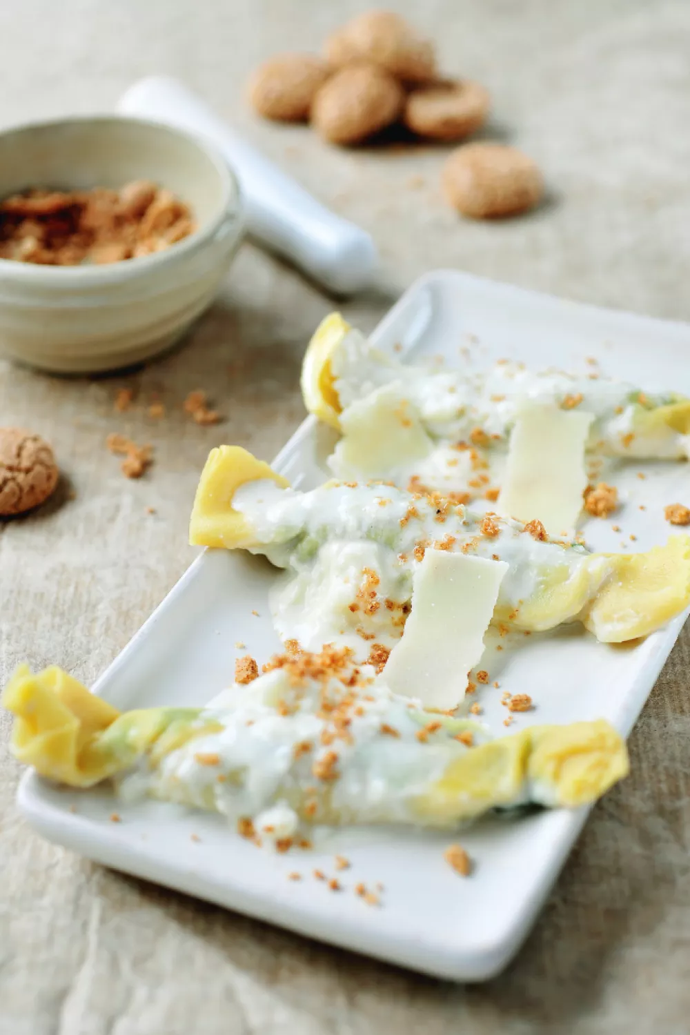 Deze verse pastasnoepjes gevuld met smeuïge pompoen, krokante amarettikoekjes en een rijke vierkaassaus brengen de herfst op je bord. Het zelfgemaakte semoladeeg wordt uitgerold en tot kleine snoepjes gevuld en kort gekookt, waarna smeltende gorgonzola, pecorino, fontina en grana padano alles omsluiten. Perfect voor een feestelijk diner of als warme comfortmaaltijd.
