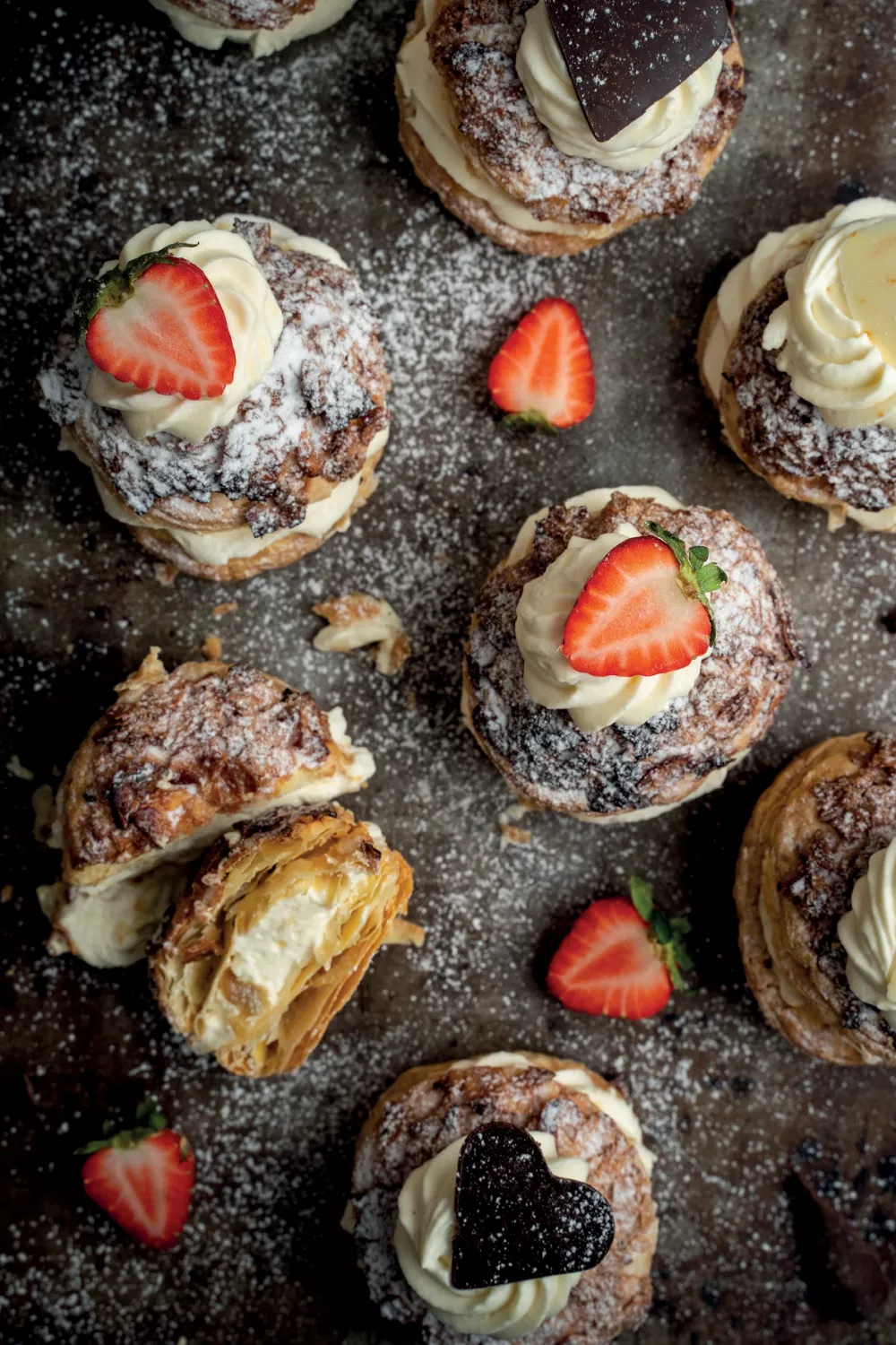 Lichte, krokante victoria’s met een rijke vanillebanketbakkersroom en romige slagroom, afgewerkt met citroenrasp en amandelschaafsel. Deze kleine bladerdeeggebakjes combineren knapperigheid en zachte crème en zijn ideaal voor high tea, als feestelijk dessert of bij de koffie in lente en zomer. Je maakt ze met eenvoudig bladerdeeg, een amandeltopping en werkt ze af met een spuitzak voor elegante roomrozetten terwijl een korte tweede baktijd de lagen extra krokant maakt.