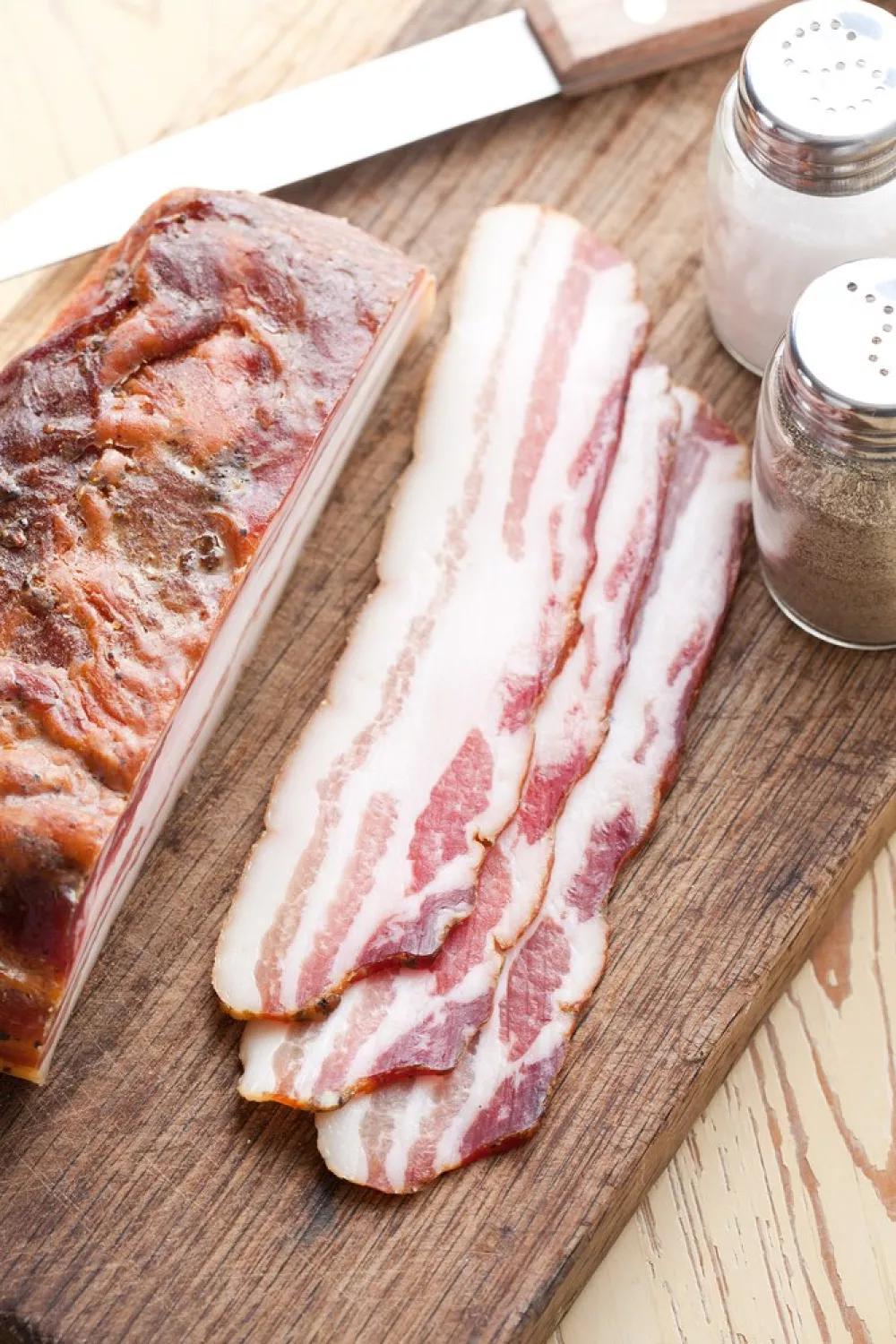 Strijk de vormpjes in met gesmolten boter en bekleed met het spek.