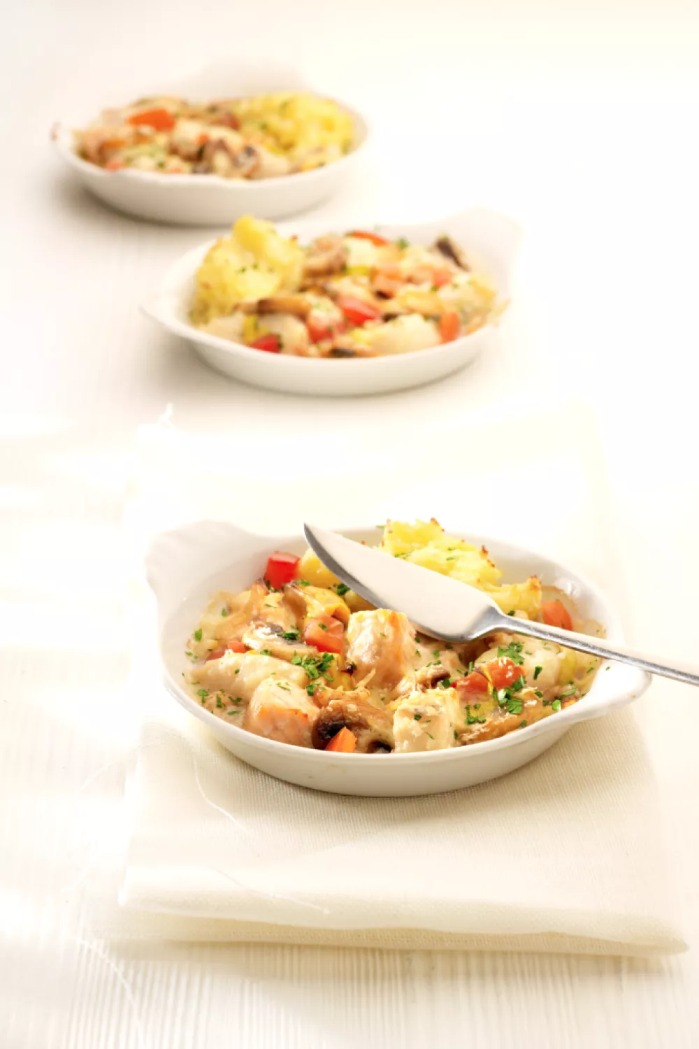 Een romig vispannetje boordevol zeevruchten en zachte witvis, afgewerkt met een goudbruine gratin van gruyère en paneermeel. Met Sint Jakobsvruchten, grijze garnalen, mosselen, zalm en kabeljauw en een saus van witte wijn en room is dit een feestelijke ovenschotel voor koude avonden of een familiediner. Aardappelpuree omlijst de vulling, de vis wordt kort gestoofd en vervolgens gegratineerd in de oven voor een knapperige bovenlaag.