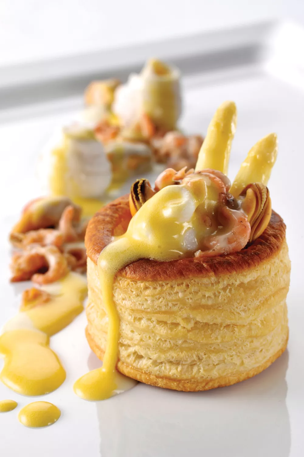 Deze klassieke visvidee is een verfijnd visgerecht waarin gerolde tongscharfilets samen met grijze garnalen, mosselen en zachte witte aspergekopjes samenkomen in een rijke visbouillon en romige mousselinesaus. De bereiding combineert zacht trekken in bouillon, kort stomen van asperges en een fluweelachtige saus op basis van room en eierdooiers, afgewerkt met warme bladerdeeggebakjes voor een feestelijke toets. Perfect als voorname lente- of feestmaaltijd voor een huwelijksmenu of chique diner, met een frisse droge witte wijn als ideale begeleider.