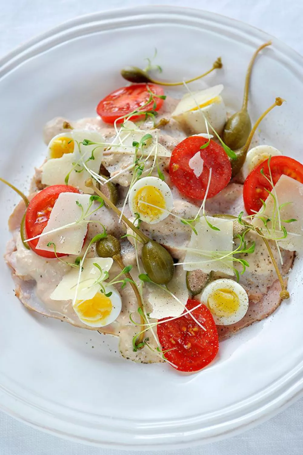 Vitello tonato met varkensvlees is een verrassende twist op de klassieke Italiaanse koude vleesschotel: malse, dun gesneden varkenskroon overgoten met een romige tonijnsaus op basis van ansjovis en kappertjes. Friszure tomatensla met basilicum en dragonazijn, kwarteleitjes en parmezaanschilfers geven kleur en textuur, perfect als feestelijk voorgerecht in lente en zomer. De saus maak je snel en zijdezacht in de mixer na het weken van de ansjovis in melk.