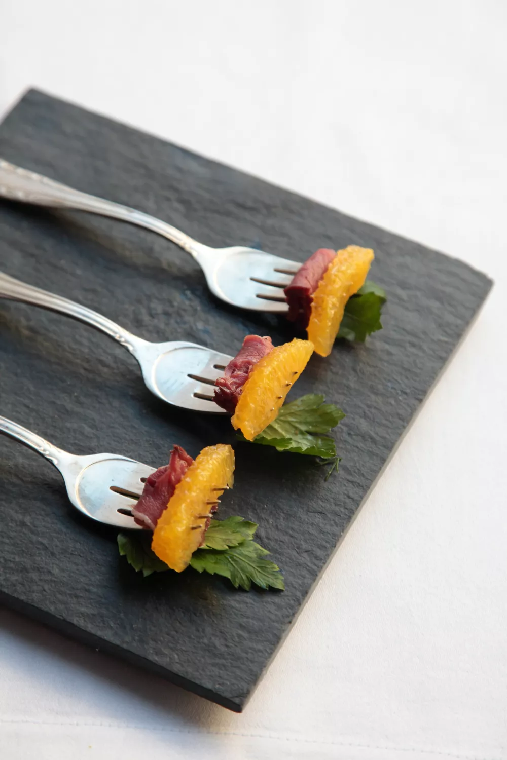 Een elegant vorkhapje waarin de rokerige smaak van gerookte eendenborst samenspeelt met frisse geparfumeerde partjes sinaasappel en een tik zwarte peper. In enkele minuten snij en fileer je, rol je het vlees op en werk je af met peterselie voor een licht, koud en chic aperitief of voorgerecht. Ideaal voor de feestdagen en winterse borrels, als snelle amuse of fingerfood bij een brunch.