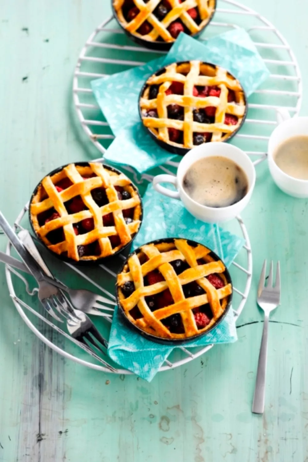 Knapperige zanddeegbakjes gevuld met frisse frambozen en sappige bosbessen, afgewerkt met amandelpoeder en een vleugje citroenrasp voor extra aroma. Deze klassieke, huisgemaakte vruchtentaartjes maak je snel door het deeg kort te mixen, te koelen en af te werken met een fijn raster van reepjes voor een goudbruine korst. Perfect als zomers dessert, bij de brunch of voor een picknick, geserveerd met custard of vanillepudding.