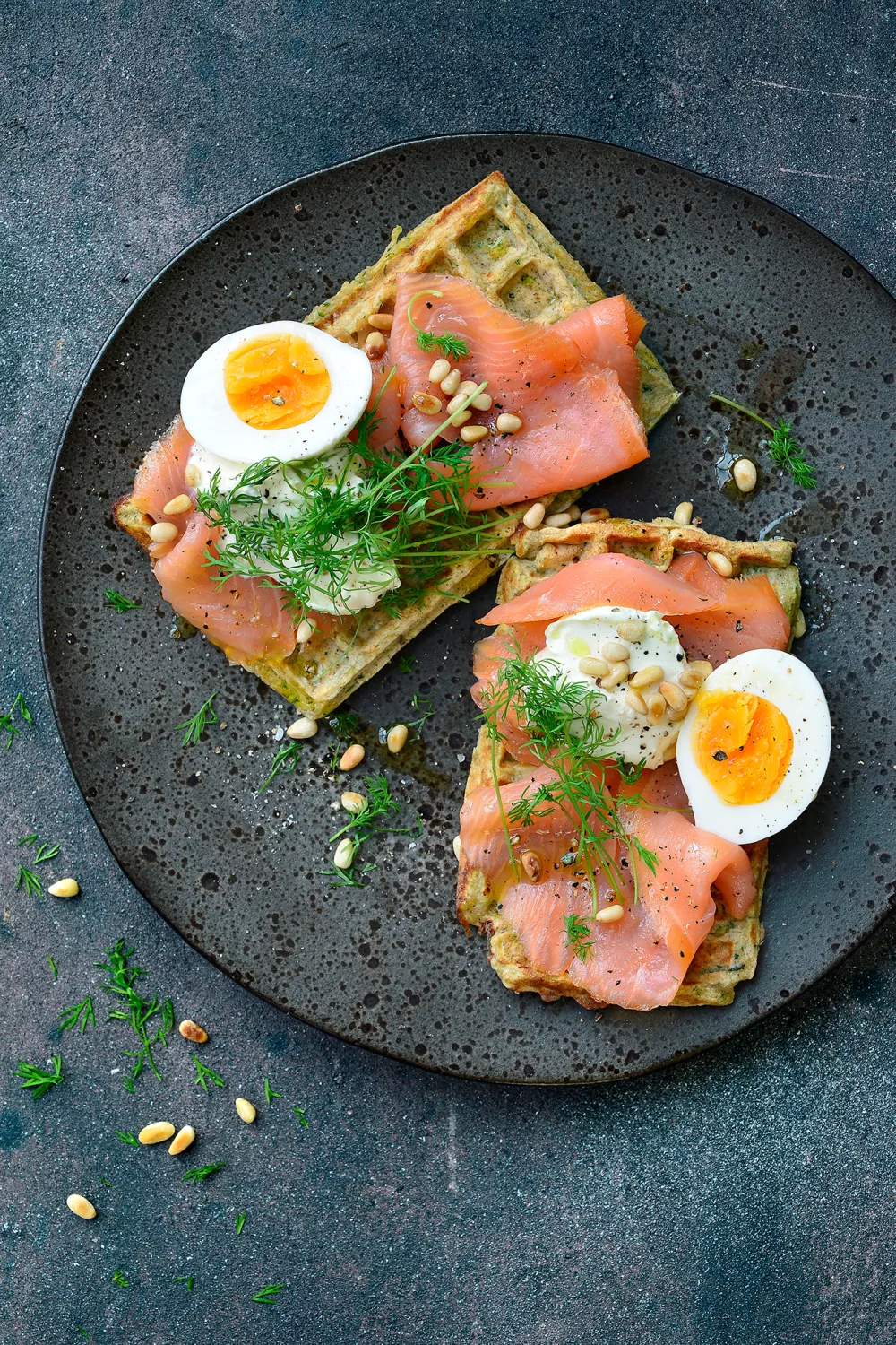 Verhit een wafelijzer en vet in met wat boter. Gebruik voor iedere wafel 1 flinke eetlepel van het beslag. Bak de wafels van courgette en leg ze op een bord. Werk af met gerookte zalm, pijnboompitten, het zachtgekookt eitje, zure room en verse dille.