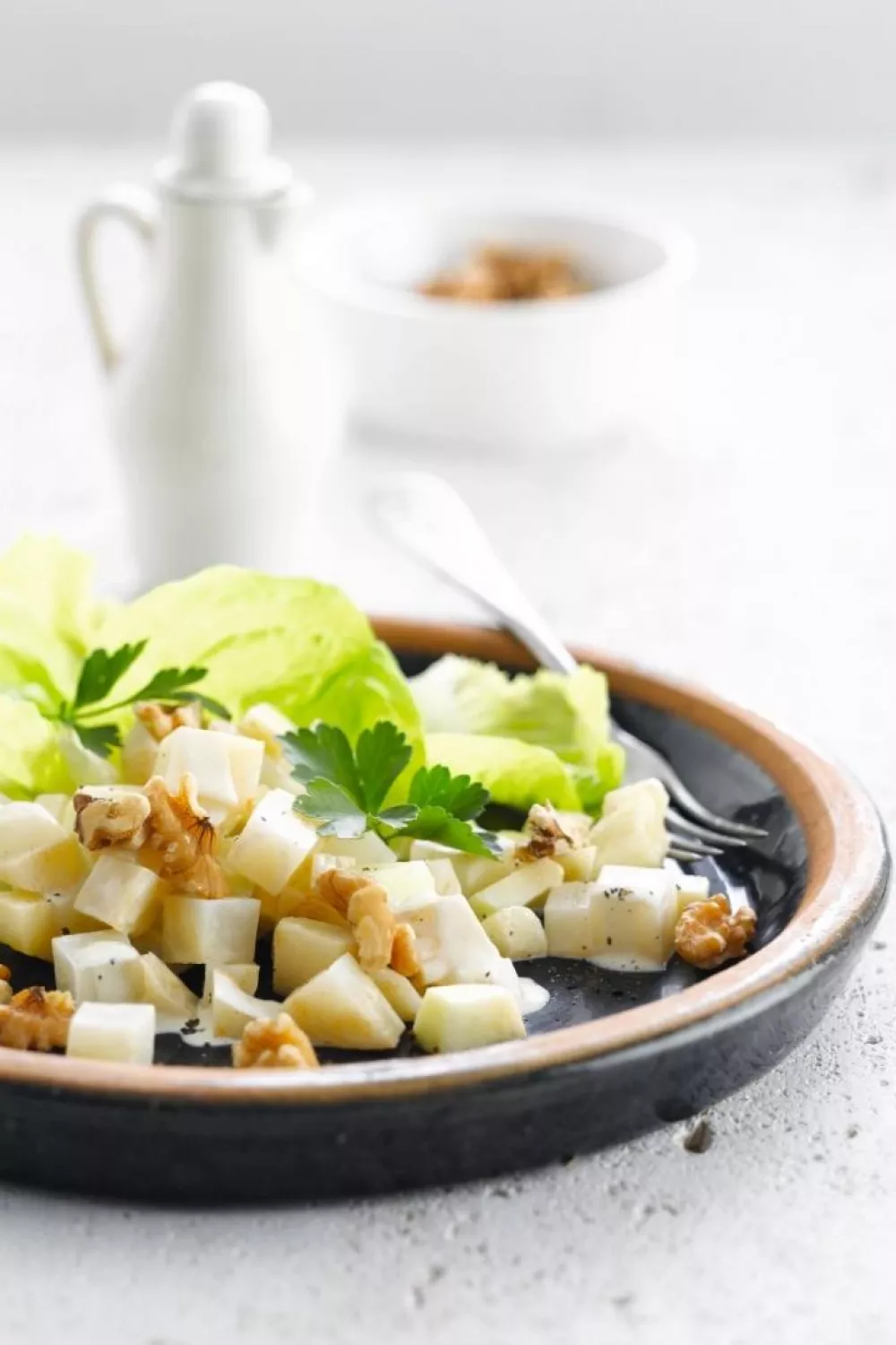 Leg de blaadjes in een diepe schaal. Schik in het midden de knolselder-appelmengeling. Strooi er de walnoten over. Versier met een paar blaadjes peterselie.