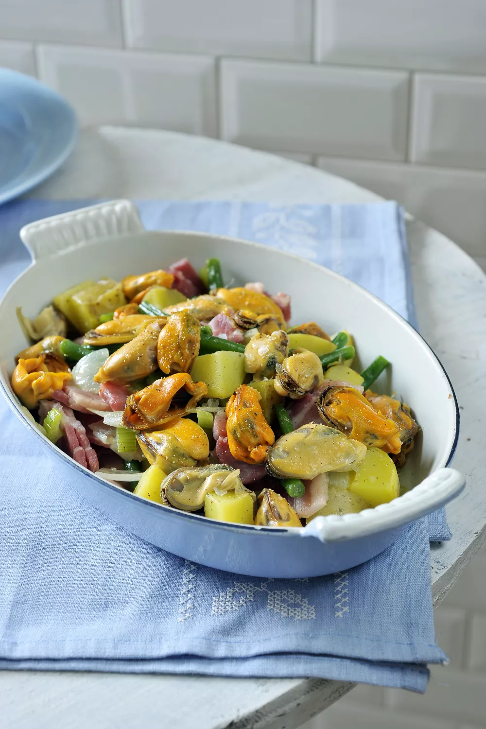 Deze warme salade met mosselen en gerookt spek combineert zeevruchten, frisse selder en hartige aardappelen tot een gezellige, rustieke maaltijd. Kort gekookte boontjes en beetgare aardappelblokjes worden samen met ui en boter gebakken, terwijl de mosselen eerst gestoomd en daarna in bloem lichtbruin gebakken worden voor extra smaak. Met een scheutje azijn en versgemalen peper is dit gerecht perfect voor een zomerse avond of een informeel diner met vrienden.