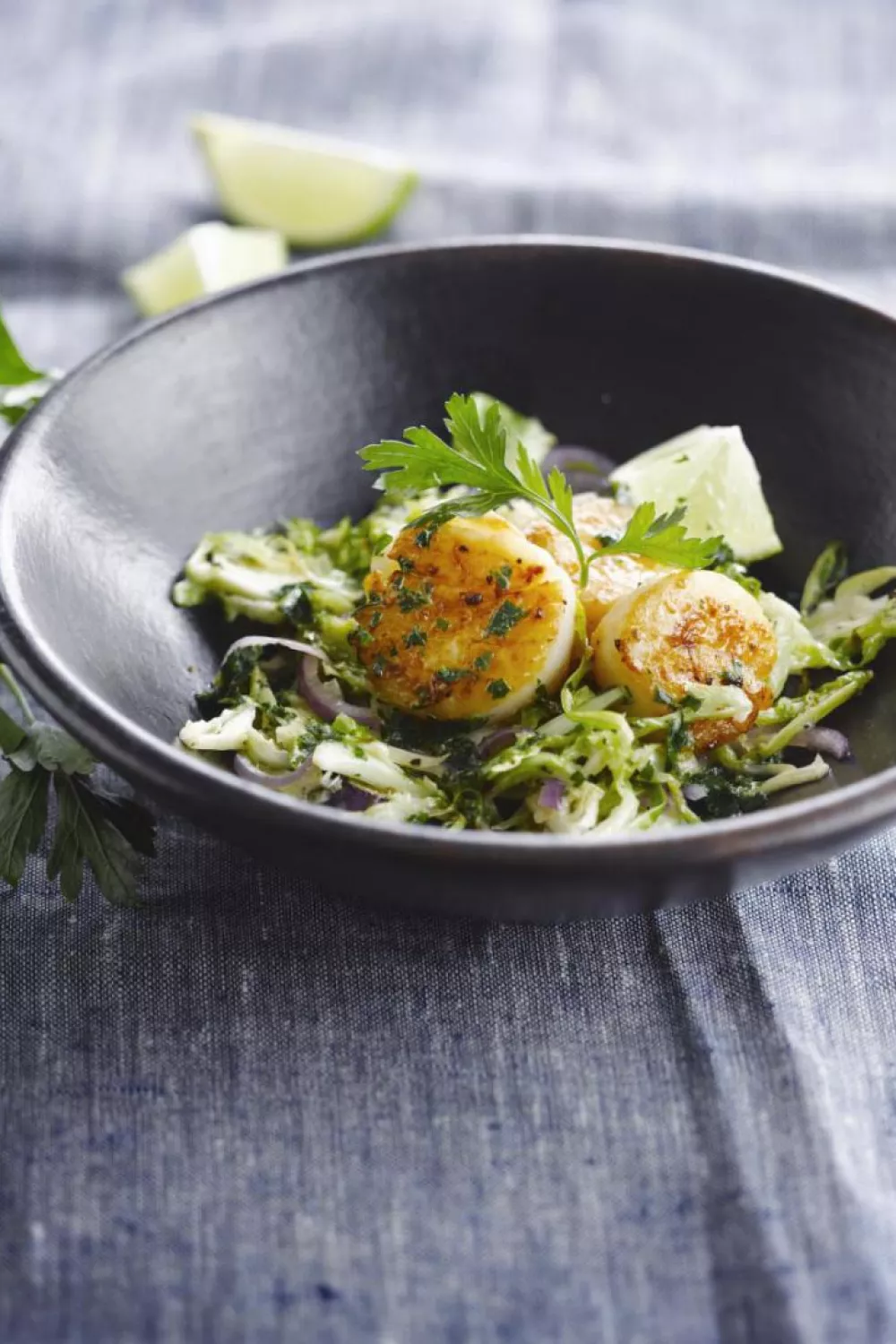 Een warme spruitensalade met goudbruin gebakken sint-jakobsvruchten brengt winterse smaken en een feestelijke toets aan je bord. Dun gesneden spruitjes worden kort geroerbakt met limoen en nootmuskaat, terwijl coquilles snel in boter worden aangebakken voor een krokante buitenkant en zachte binnenkant. Afgewerkt met aromatische peterselieboter is dit een elegant maar eenvoudig hoofdgerecht voor een gezellig diner of bijzondere lunch.
