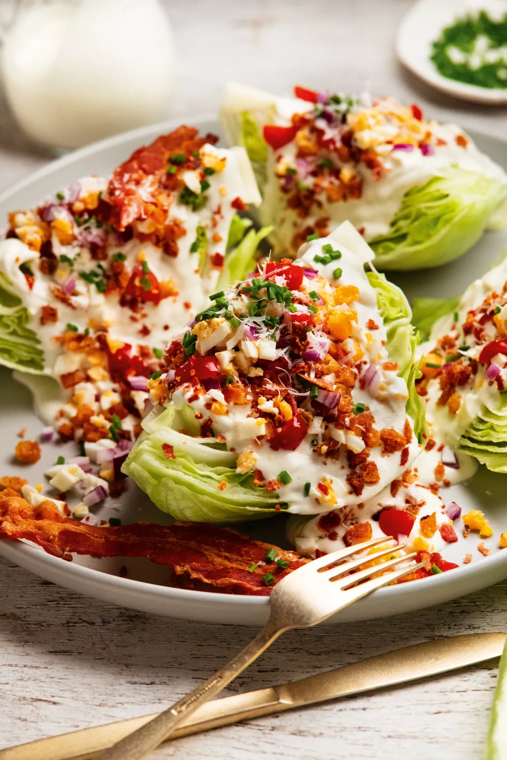 Een knapperige wedgesalade vol smaak met goudbruin ontbijtspek, romige blauwschimmelkaasdressing en huisgemaakte ciabattacroutons. IJsbergsla krijgt extra bite door krokant gebakken spek en croutons terwijl ei, kerstomaat, rode ui en Parmezaan frisheid en diepte toevoegen. Snel te bereiden op het fornuis en ideaal als zomers bijgerecht, lichte lunch of voor bij een barbecue.