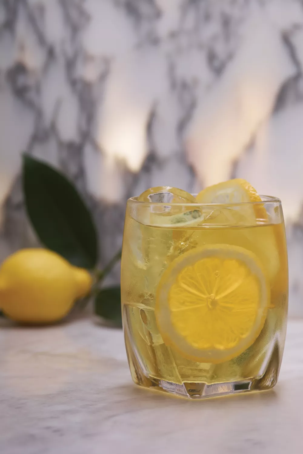 Snijd twee partjes citroen en doe ze in het glas. Steek met een cocktaillepel in het vruchtvlees en de schil, zodat het sap en de aroma’s vrijkomen. Voeg de overige ingrediënten toe. Voeg ijsblokjes toe en roer goed.