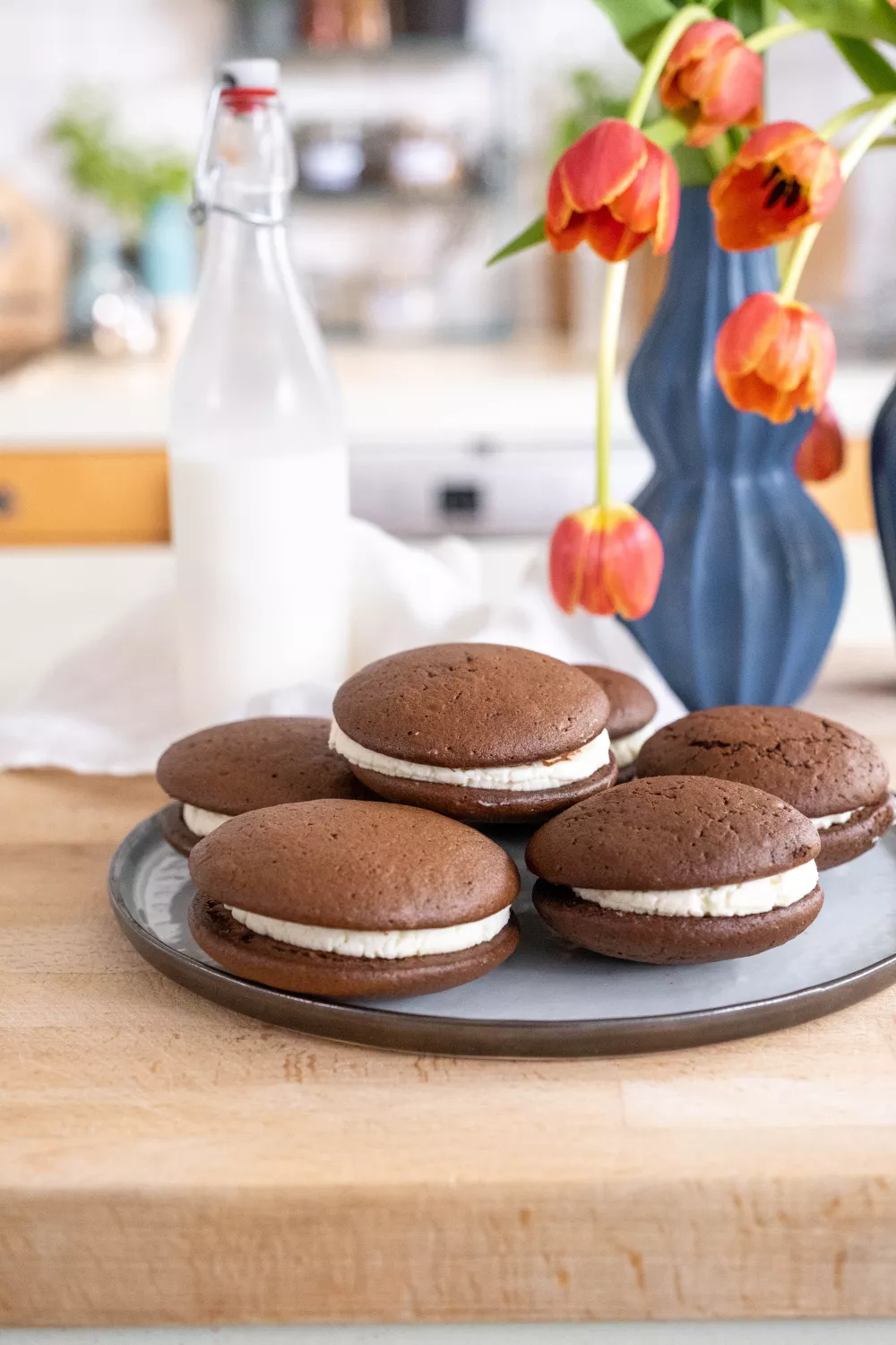 Luchtige chocolade whoopie pies met een romige mascarponevulling, perfect voor bij de koffie, een brunch of een gezellig feestje in herfst en winter. Het zachte cakedeeg met karnemelk, zonnebloemolie en cacaopoeder wordt kort gemengd en in ronde koekjes opgespoten en in de oven gebakken tot ze licht gerezen zijn. Vul ze met opgeklopte mascarpone en slagroom met bloemsuiker voor een fluweelzacht contrast en serveer als huisgemaakt dessert of traktatie.