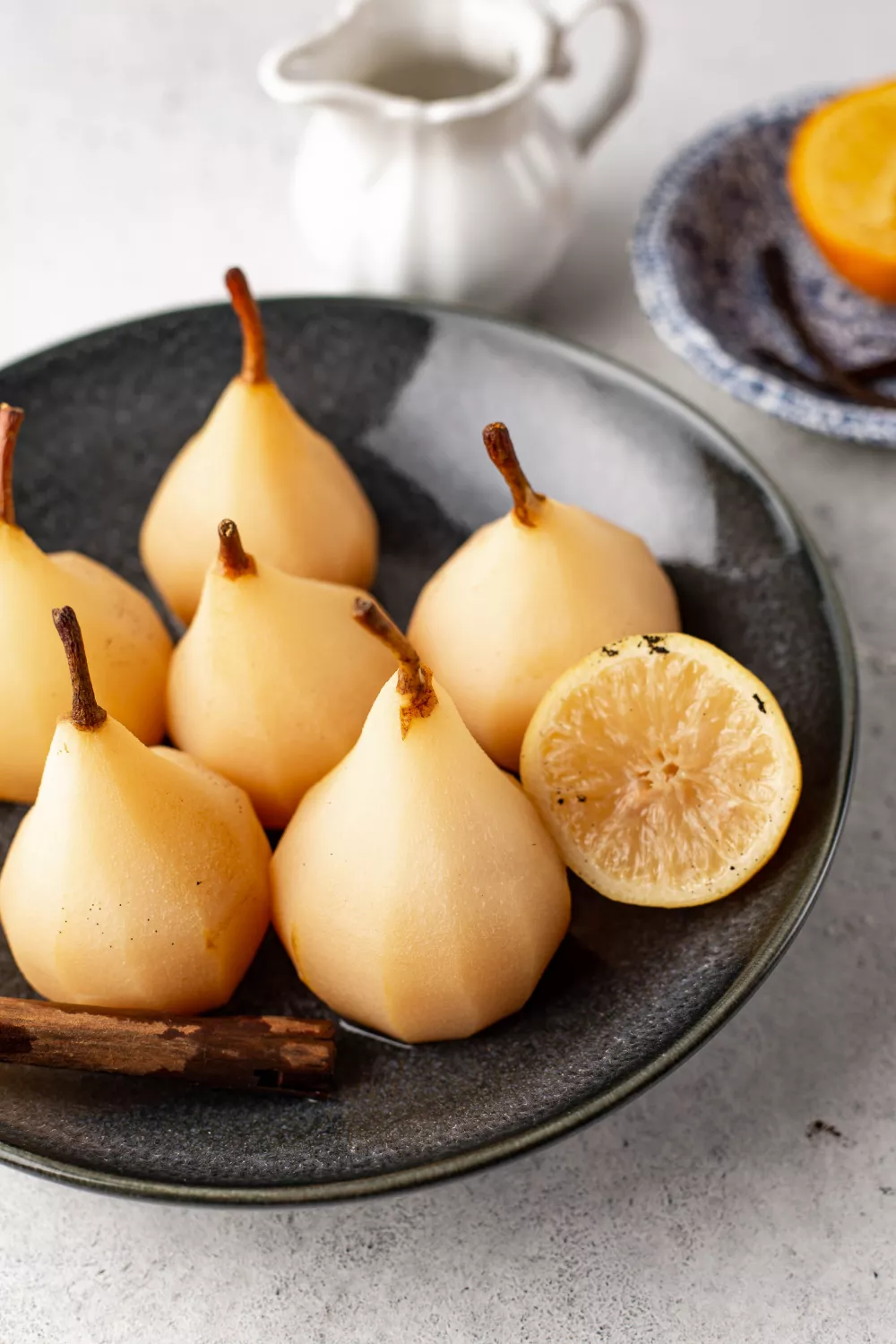 Zacht gegaarde witte stoofpeertjes in zoete witte wijn met kaneel en vanille vullen de keuken met warme herfstige en feestelijke geuren. Een frisse toets van citroen en sinaasappel snijdt door de zoetheid terwijl de peren langzaam in de wijn pruttelen tot ze boterzacht zijn. Dit eenvoudige, klassieke stoofgerecht is heerlijk als winters dessert of bij kaas en chocolade.