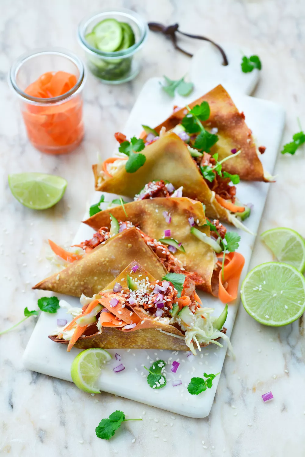 Vul de gleuf van de wontonvellen met witte kool, rode ui, opgelegde wortel en komkommer, BBQ chicken, sesamzaad en verse koriander.