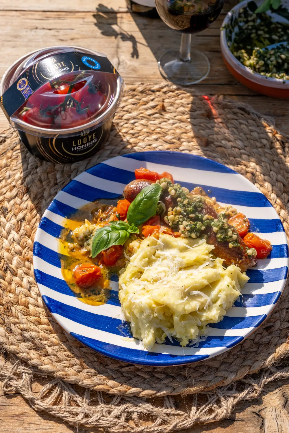 Schep een flinke lepel puree op een bord. Schik er een worst naast met wat tomaatjes en mozzarella. Werk af met de groene pesto.
