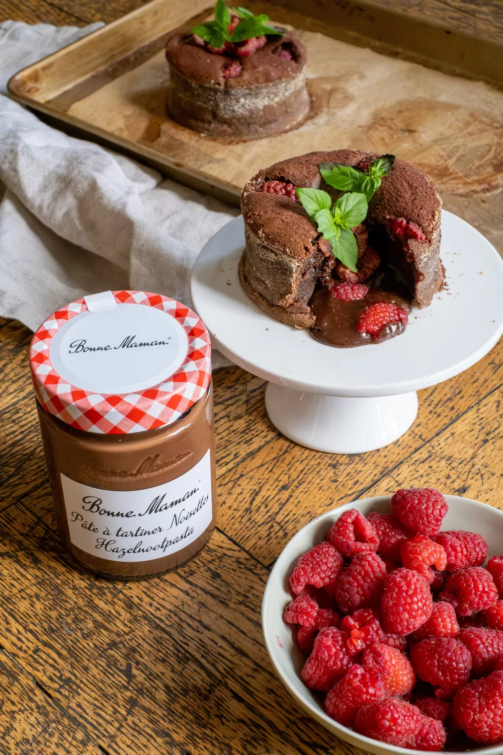 Een warm hart van gesmolten chocolade, een vleugje romige Bonne Maman hazelnootpasta en een zachte, luchtige korst: deze moelleux van chocolade volgens Wim Ballieu is pure verleiding op je bord. Perfect als XL-dessert om te delen (of niet!) en onweerstaanbaar met frambozen en munt.