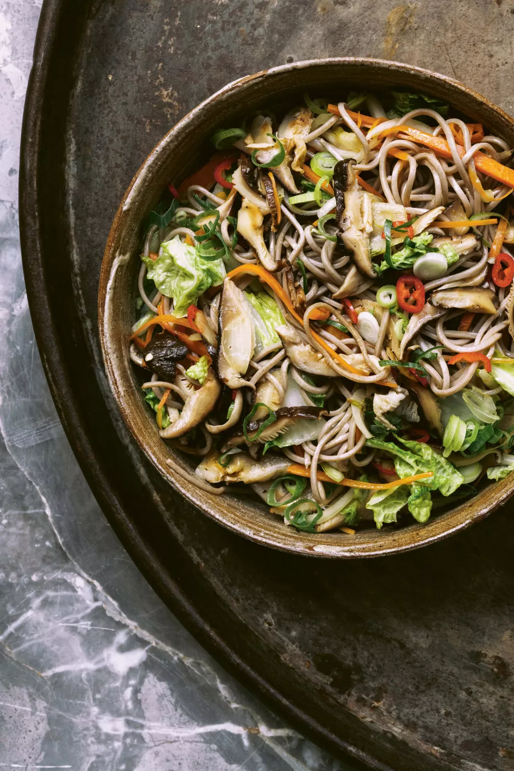 Knapperige groenten en geurige sobanoedels in een romige, licht zoetzure sojasaus met shiitake en geroosterde sesamolie maken dit snelle wokgerecht tot comfort food voor elke dag. Kort wokken en even stomen onder een deksel zorgt voor perfect gegaarde noedels en veel smaak, dankzij shoyu, gembersap en rijstazijn. Ideaal als voedzame doordeweekse maaltijd, warme lunch of bij een Aziatisch diner.