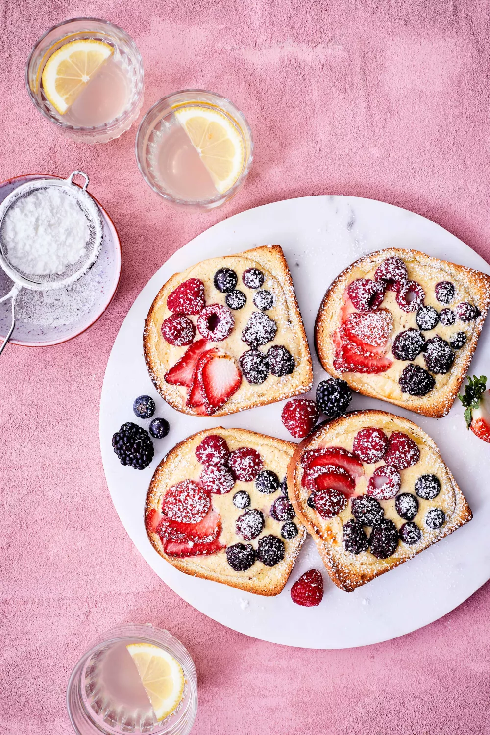 Luchtige brioche toasts met romige Griekse yoghurt, kaneel en een sappige topping van rood fruit zijn perfect als feestelijke brunch of zomers dessert. In dit eenvoudige ovenrecept worden kuiltjes in het brood gevuld met een mengsel van yoghurt, ei en honing en vervolgens goudbruin gebakken. Bestrooi met poedersuiker voor een elegante afwerking, ideaal voor lenteochtenden, feestelijke brunches of snelle zoete hapjes.