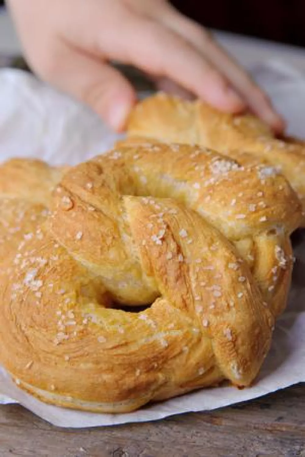 Verdeel het deeg in 6 porties, rol van het deeg lange veters. Leg de veters in een U vorm, draai de uiteinden een slag om elkaar en vouw de uiteinden naar beneden. Duw ze vast in het deeg.