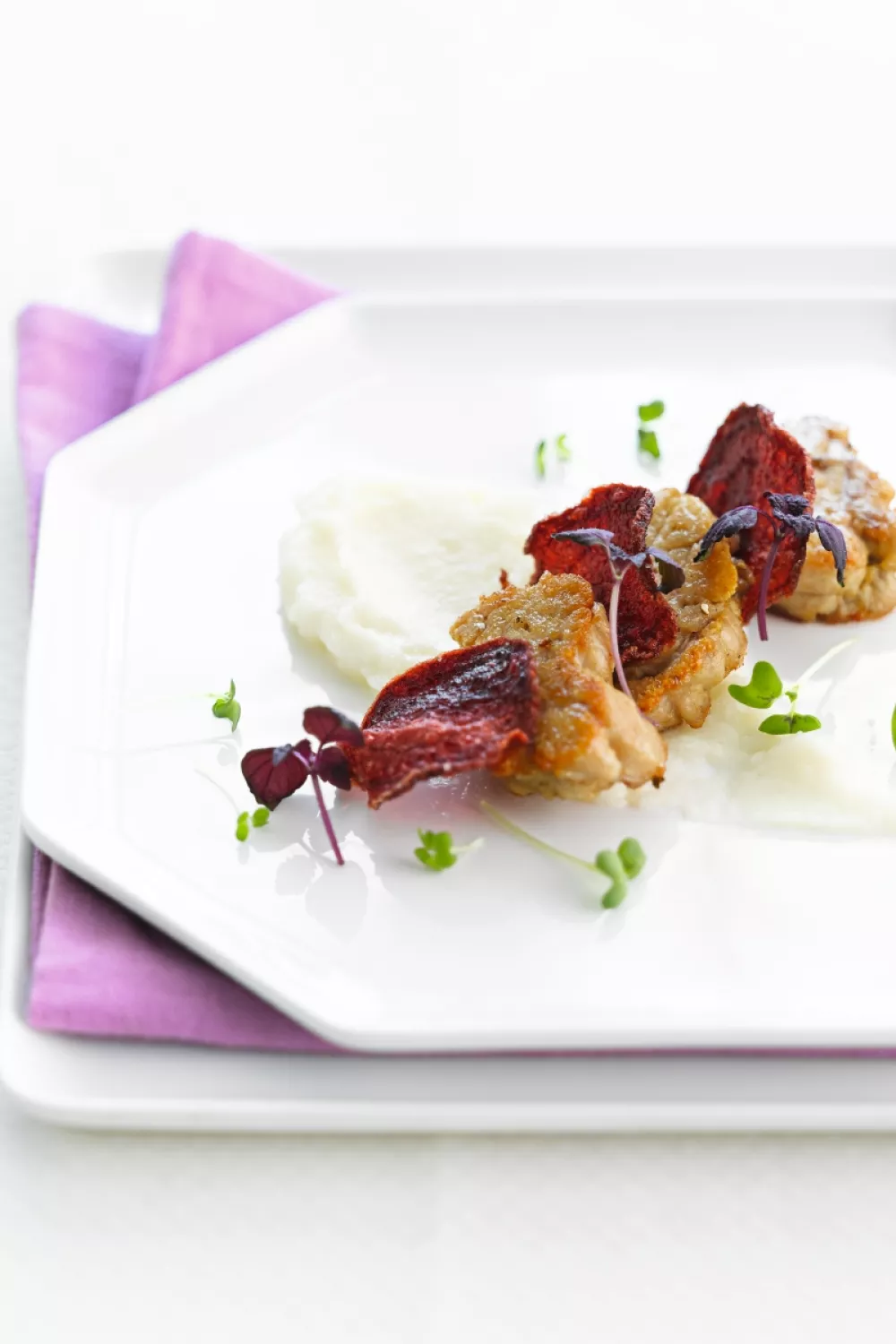 Romige bloemkoolzalf vormt de zachte basis voor dit verfijnde gerecht met gebakken kalfszwezerik en krokante chips van rode biet. De zwezerik wordt eerst kort gekookt en vervolgens zachtjes gestoofd in gevogeltebouillon en boter alvorens krokant te bakken, terwijl de bloemkool in de blender tot een fluwelen zalf wordt gepureerd. De fritturen van dunne bieten geeft kleur en bite, ideaal voor een elegant najaarsdiner.