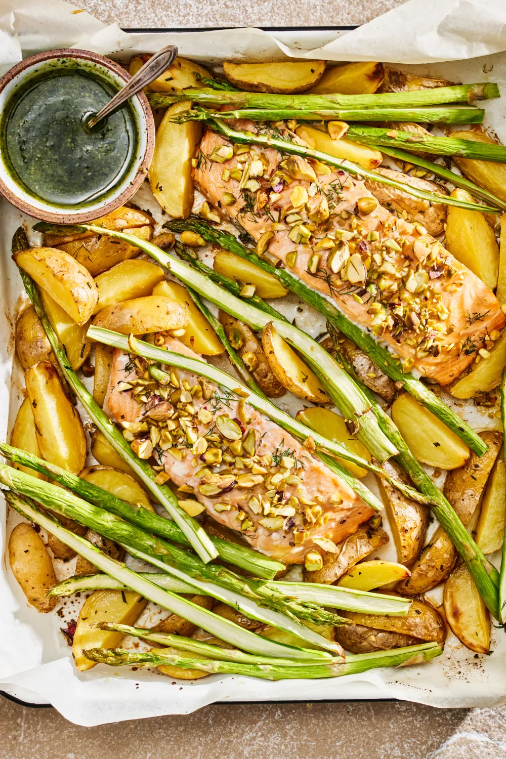 Zalm uit de oven met een zachte honing en dille marinade en krokante pistachenoten, geserveerd met geroosterde krieltjes en knapperige groene asperges. De vis wordt kort gemarineerd en meegegaard op één bakplaat zodat alles tegelijk klaar is, en een vinaigrette uit de vijzel met basilicum en pijnboompitten zorgt voor frisse, notige tonen. Perfect voor een doordeweeks diner of een lichte lente of zomermaaltijd.