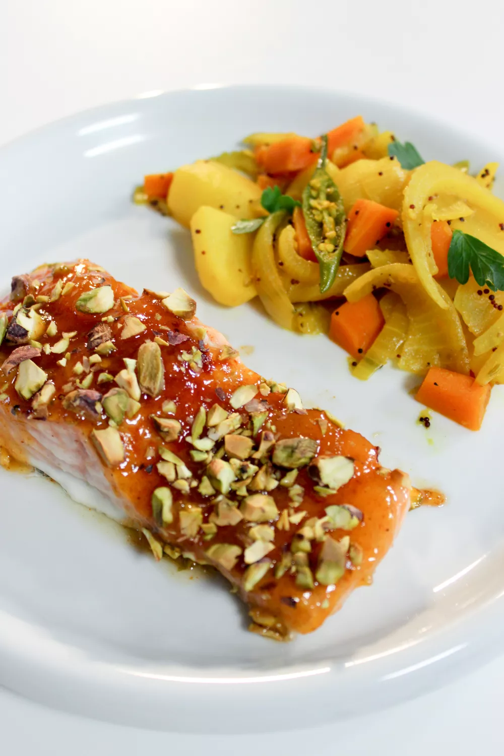 Ovengebakken zalm met romige mangochutney en krokante pistachenoten combineert zoete, pittige en frisse tonen. Daarbij gestoofde aardappeltjes, wortel en venkel met kurkuma, koriander en poppende mosterdzaadjes die kort worden afgewerkt in de pan zorgen voor warmte en bite. Een toegankelijke vismaaltijd die ideaal is voor een doordeweekse avond maar ook feestelijk genoeg is voor gasten tijdens lente en zomer.