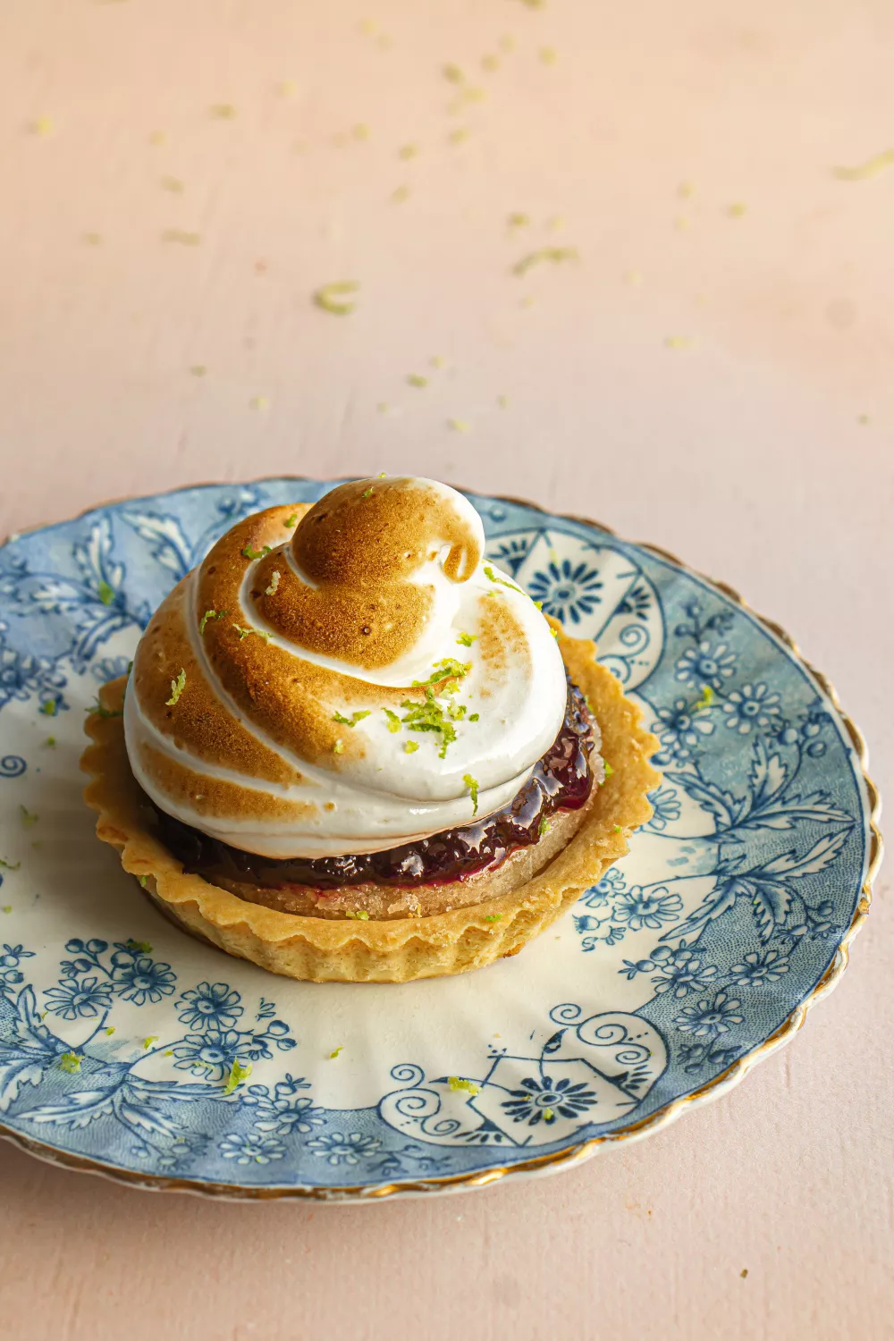 Zanddeegtaartjes met marsepein, kersenconfituur en meringue