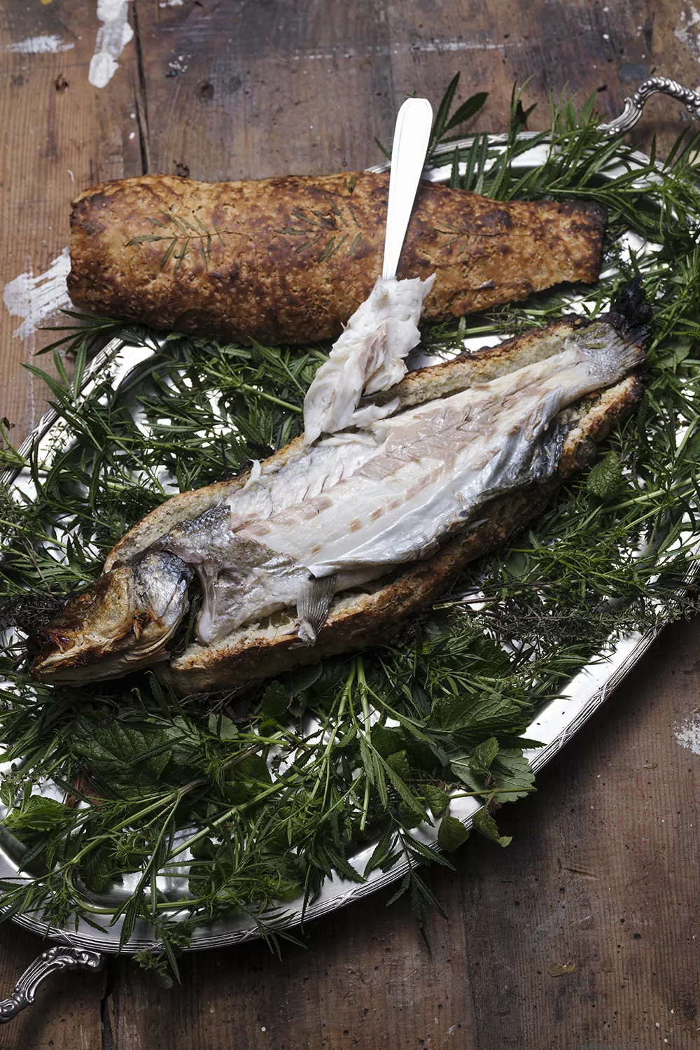 Spoel de buikholte en dep de vissen droog. Vul de buikholte met twee schijfjes limoen, de huacatay en de citroenmelisse. Leg de vis op de zoutkorst en pak hem in. De staart, vin en kop blijven uit de korst, maar sluit ze mooi af zodat er geen scheurtjes meer zichtbaar zijn.