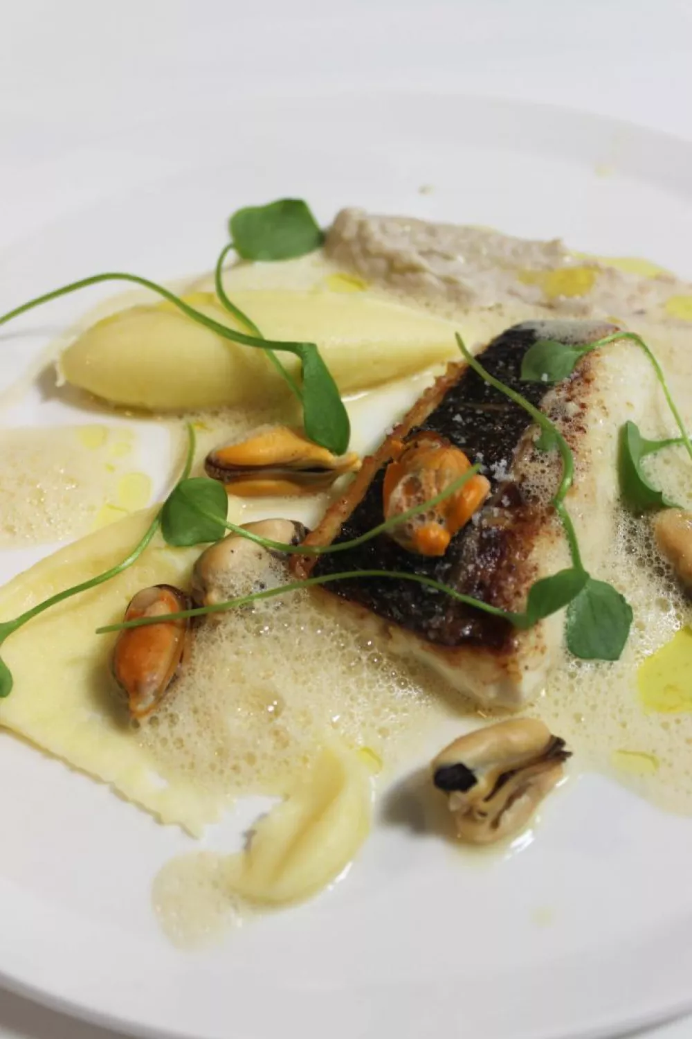Schep de zeebaars en de puree op een bord. Schuim de jus van mosselen nog even op en lepel de saus over de vis. Werk af met de crème van kastanjes, enkele mosseltjes en enkele blaadjes postelein.