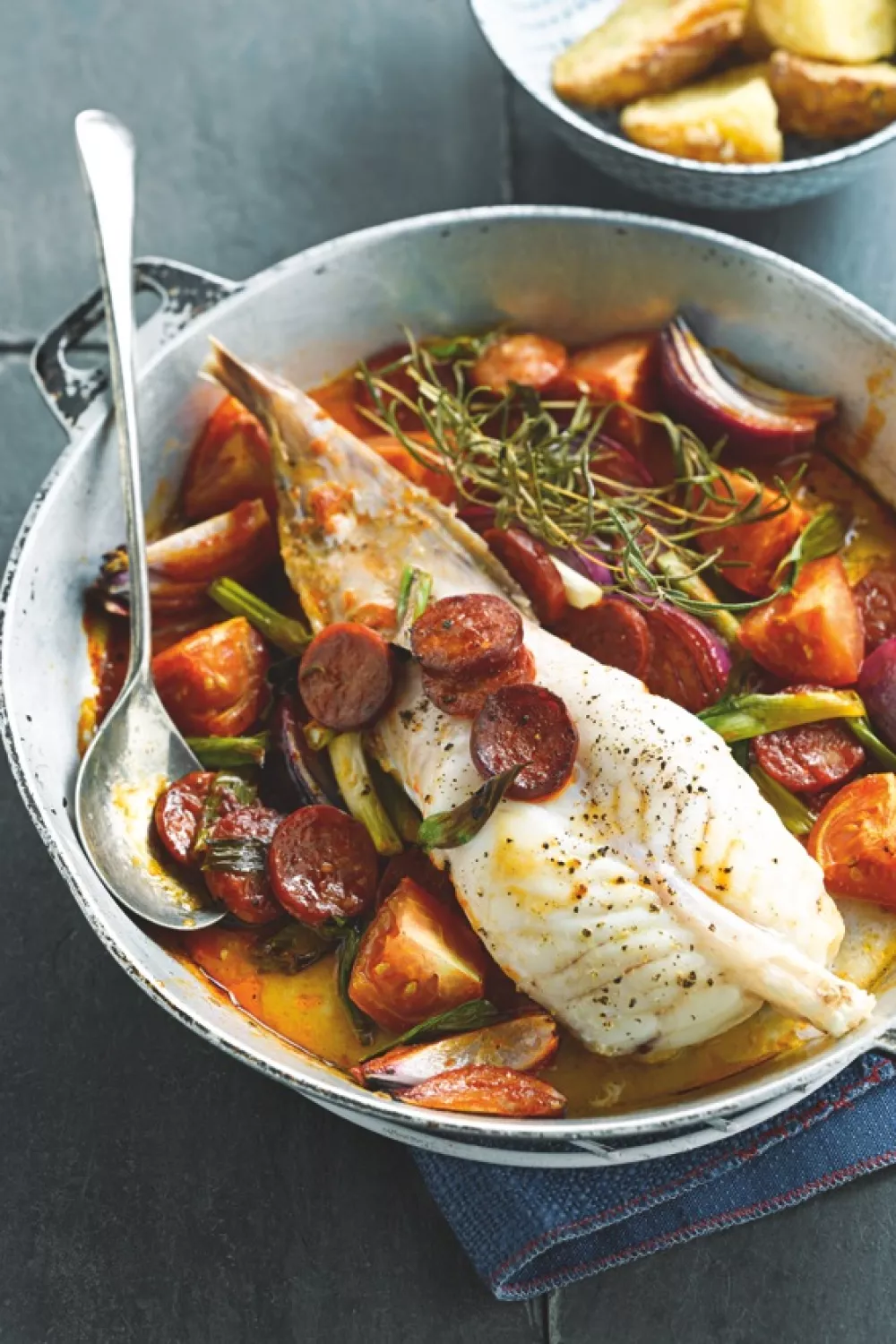 Zeeduivel met chorizo en tomaat is een robuust mediterraan visgerecht waarin de stevige, milde vis perfect combineert met pittige, rokerige chorizo en frisse citroen. In de oven gebraden met rozemarijn, knoflook en olijfolie wordt de vis sappig en krijgt het geheel een aromatische braadjus die je tijdens het braden af en toe over de vis lepelt. Heerlijk als gezellige doordeweekse maaltijd of feestelijk weekendgerecht, geserveerd met geroosterde aardappelen en een frisse salade.