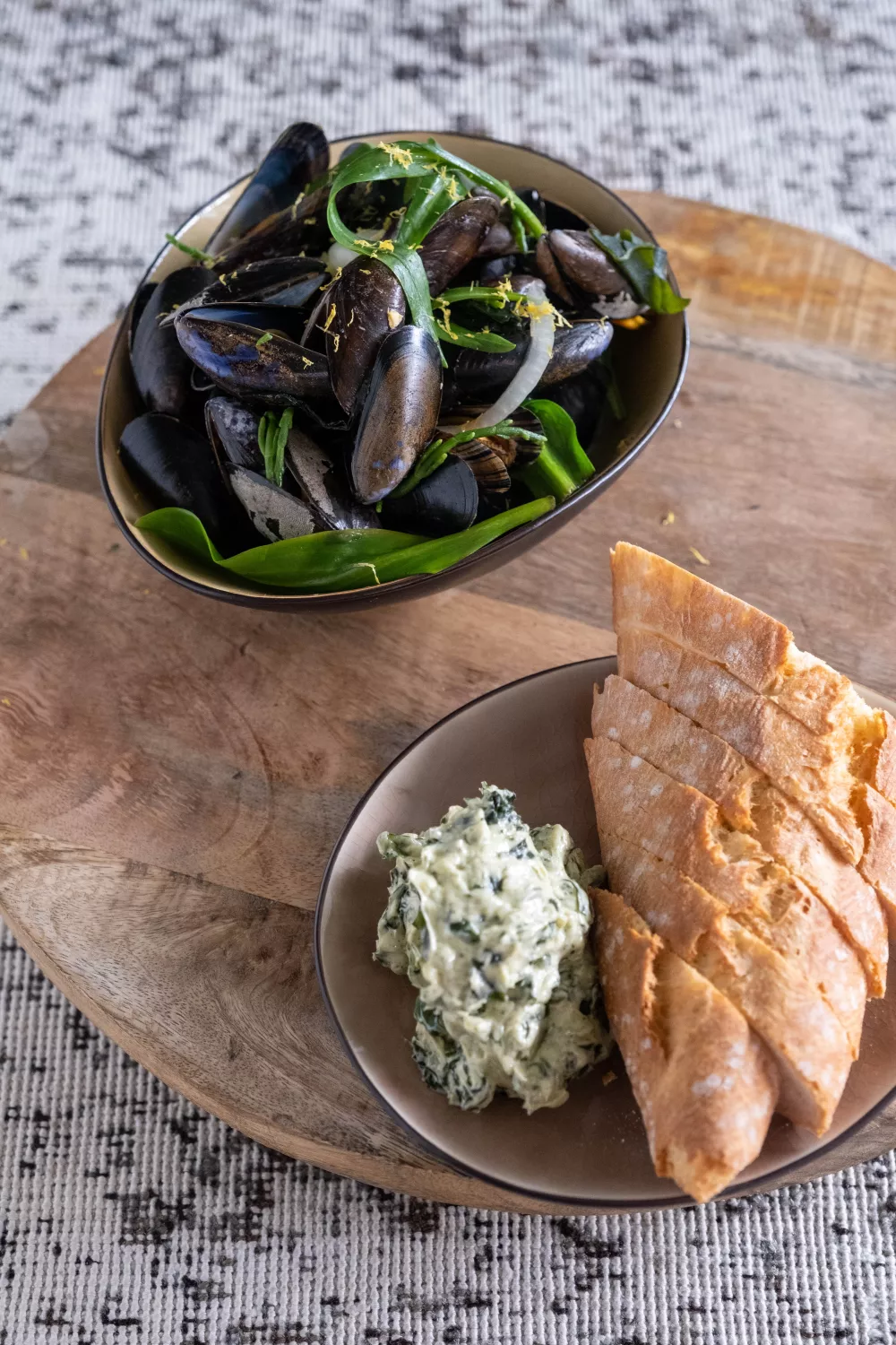 Schep de mosselen in een bord en werk ze nog af met zeste van citroen. Serveer met stokbrood en de algenboter.