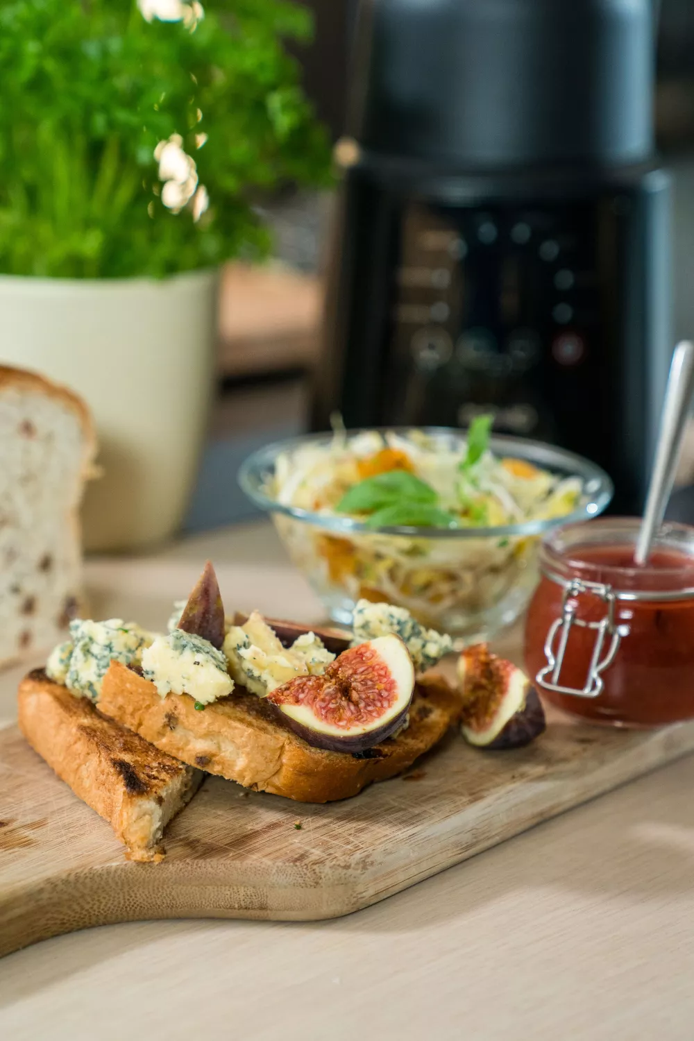 Doe de vijgenconfituur in een potje. Meng de witloofsalade met de vinaigrette. Schik mooi op een bordje samen met de toasts. Werk af met stukjes blauwe kaas.