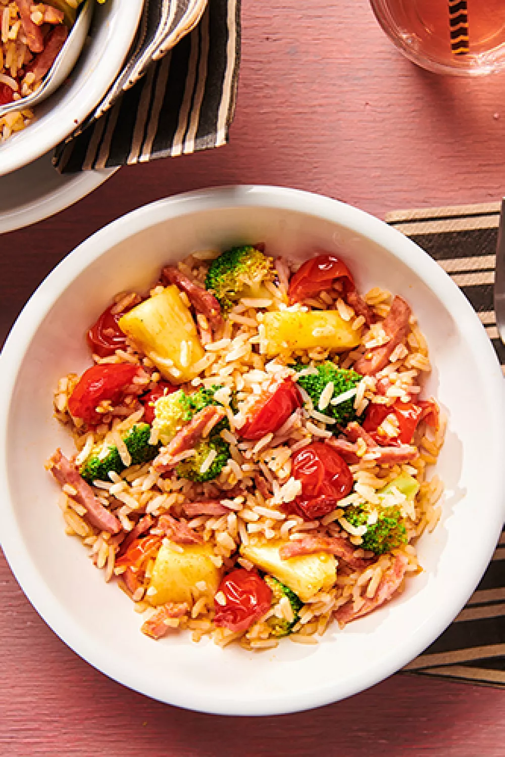 Een kleurrijke, snelle rijstschotel met zilvervliesrijst, gerookte ham, zoete ananas en knapperige broccoli die het beste van zoet en hartig combineert. In de wok roerbak je ham met paprikapoeder, tomaatjes en ananas tot alles licht gekaramelliseerd en sappig is. Perfect als voedzame doordeweekse maaltijd of zomers familiegerecht, eenvoudig aan te vullen met prei voor extra bite.