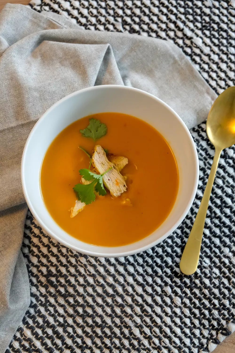 Een romige zoete aardappelsoep met warme gember, pittige rode chili en gegrilde kip brengt comfort op tafel. Gepofte aardappelen uit de oven of van de barbecue geven een subtiele rokerigheid, terwijl currypoeder en verse koriander de smaken afronden. Perfect als hartig herfstig voorgerecht of lichte lunch, eenvoudig glad te pureren in de blender.