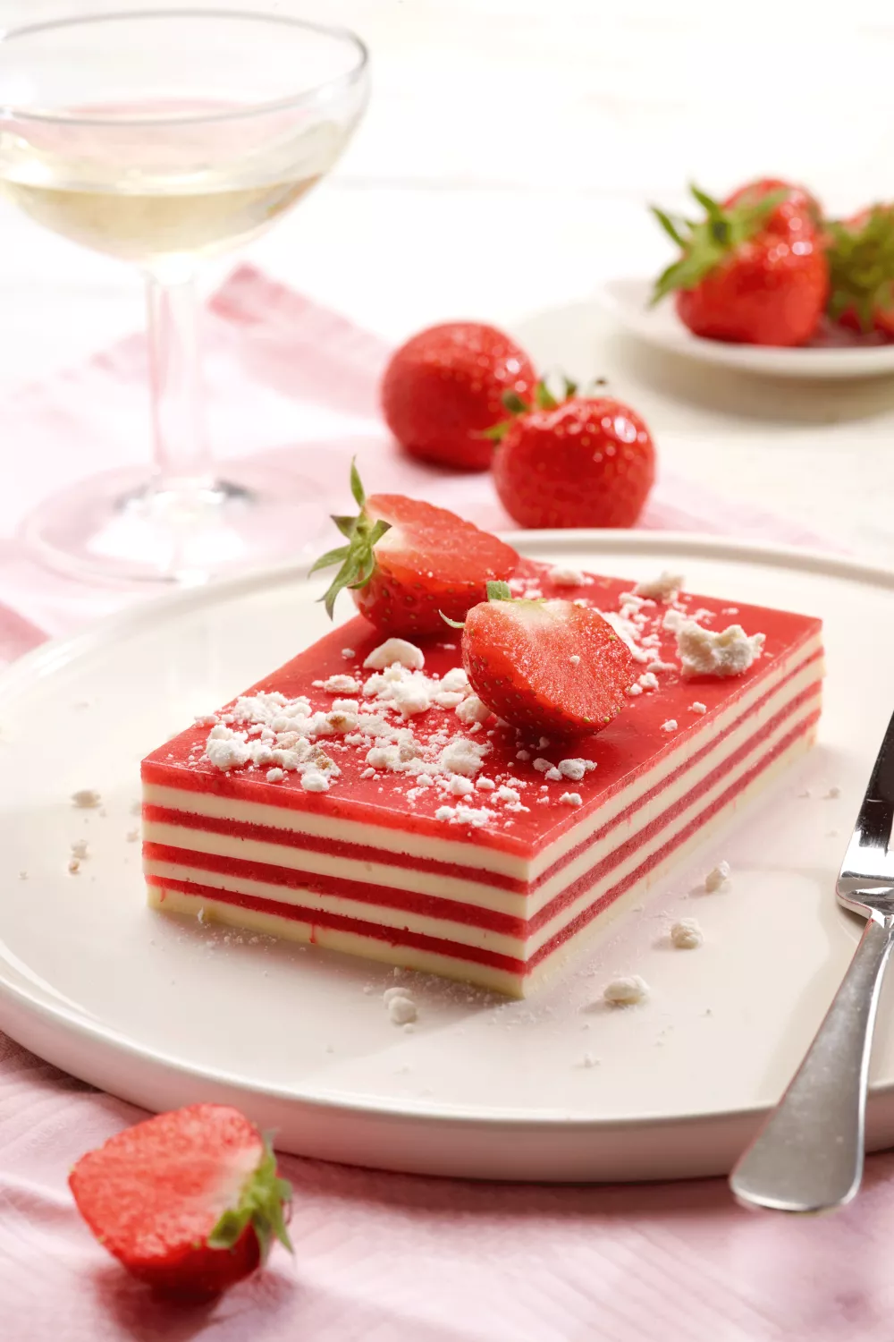 Een frisse zomerse zoete aardbeienlasagne met lagen van gelei van gepureerde aardbei en romige zure room, gefixeerd met gelatine of Kappa uit het Texturas gamma van El Bulli voor een elegante koude dessertpresentatie. De bereiding is eenvoudig: aardbeiensaus koken en gelatine oplossen, zure room met melk en Kappa kort verwarmen en laten opstijven in de koelkast. Ideaal als feestelijk nagerecht of zomerse brunch.