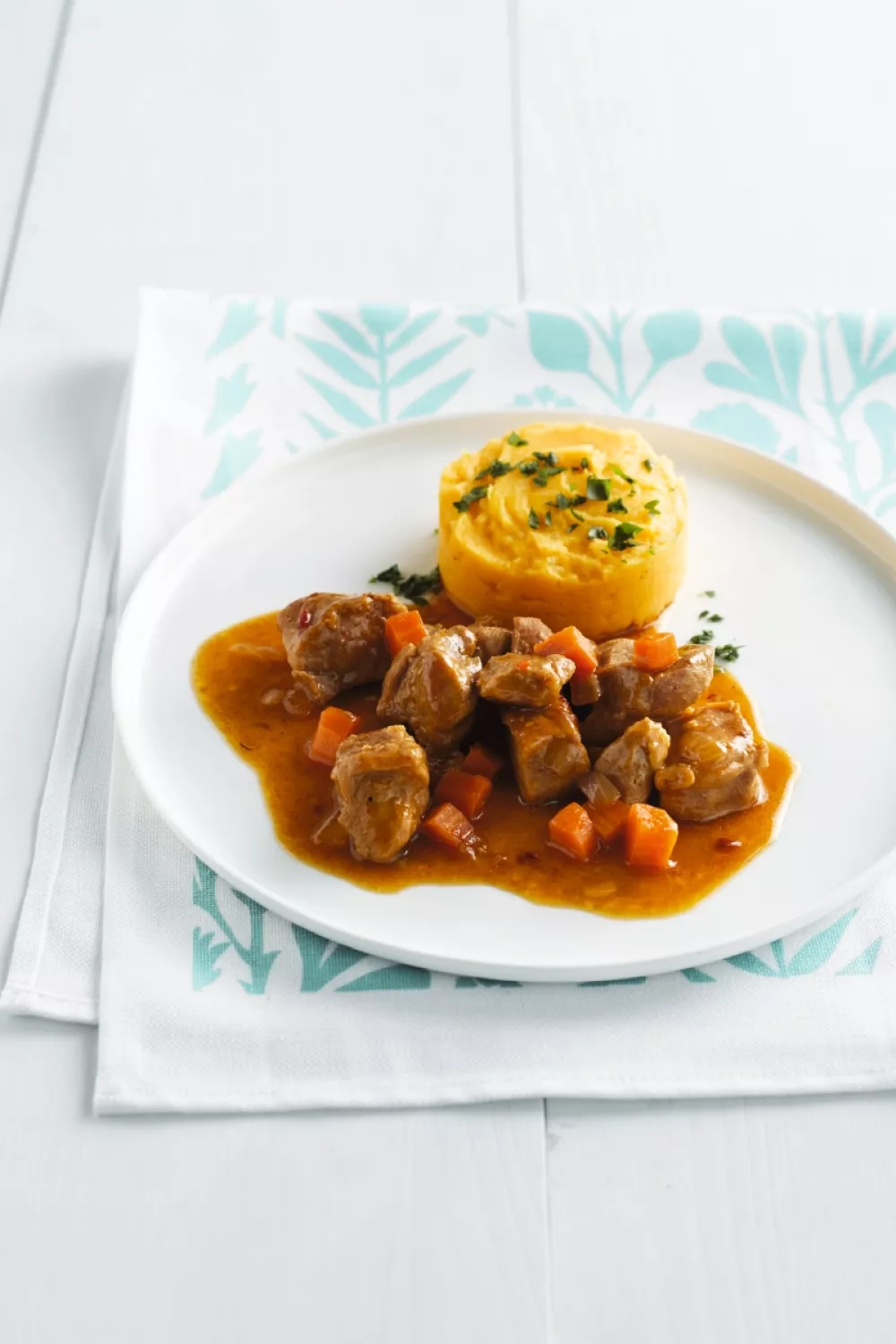 Werk het stoofvlees af met fijngesneden peterselie en serveer samen met de aardappelpuree.