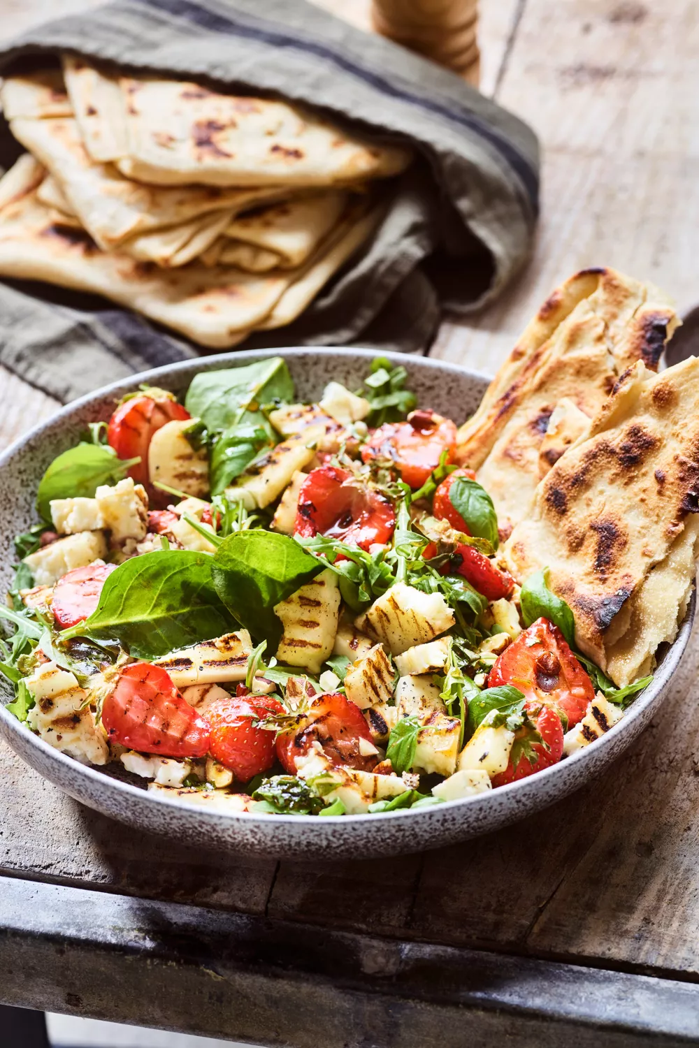 Zonnesalade met krokante msemen, gegrilde halloumi en warm gegrilde aardbei combineert zoute kaas met zoete fruittonen en een nootachtige crunch. Het gerecht gebruikt handgemaakt msemmendeeg dat op de barbecue goudbruin bakt, terwijl hazelnoten geroosterd en halloumi kort gegrild worden voor textuur en smaak. Perfect voor een zomerse lunch of lichte avondmaaltijd, afgewerkt met rucola, spinazie en een honing en rode wijnazijn vinaigrette met basilicum en peterselie.