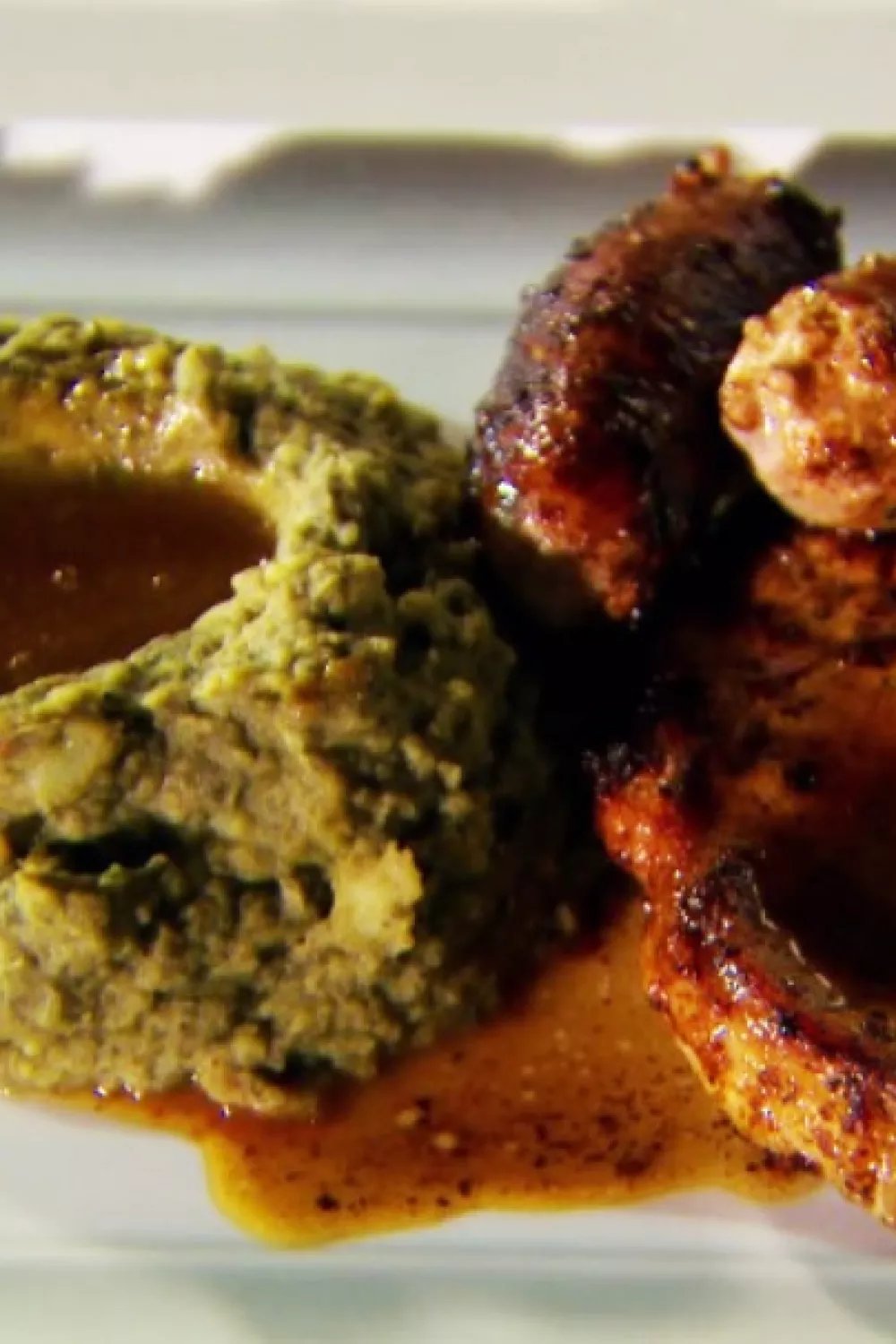 Doe een flinke schep van de zurkelpuree op een bord. Maak in het midden een kuiltje en lepel de jus hierin. Serveer samen met de koteletjes en de worst.
